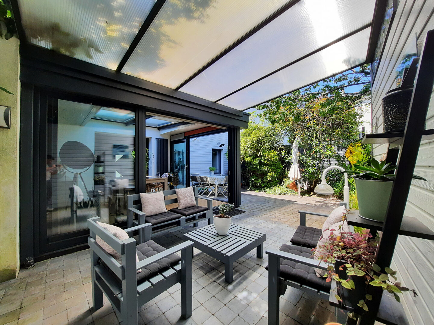 Dans un environnement verdoyant, cette maison nantaise offre une pièce de vie exposée plein sud, prolongée par un jardin intime avec terrasse et jacuzzi.