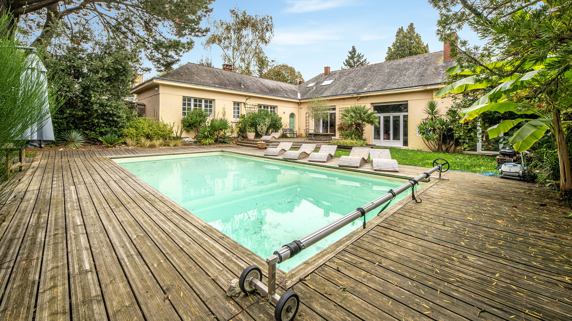 Nantes - Pont du Cens : idéalement située à deux pas des écoles, des transports et des commerces, maison pleine de charme sur magnifique jardin avec piscine sans vis-à-vis.