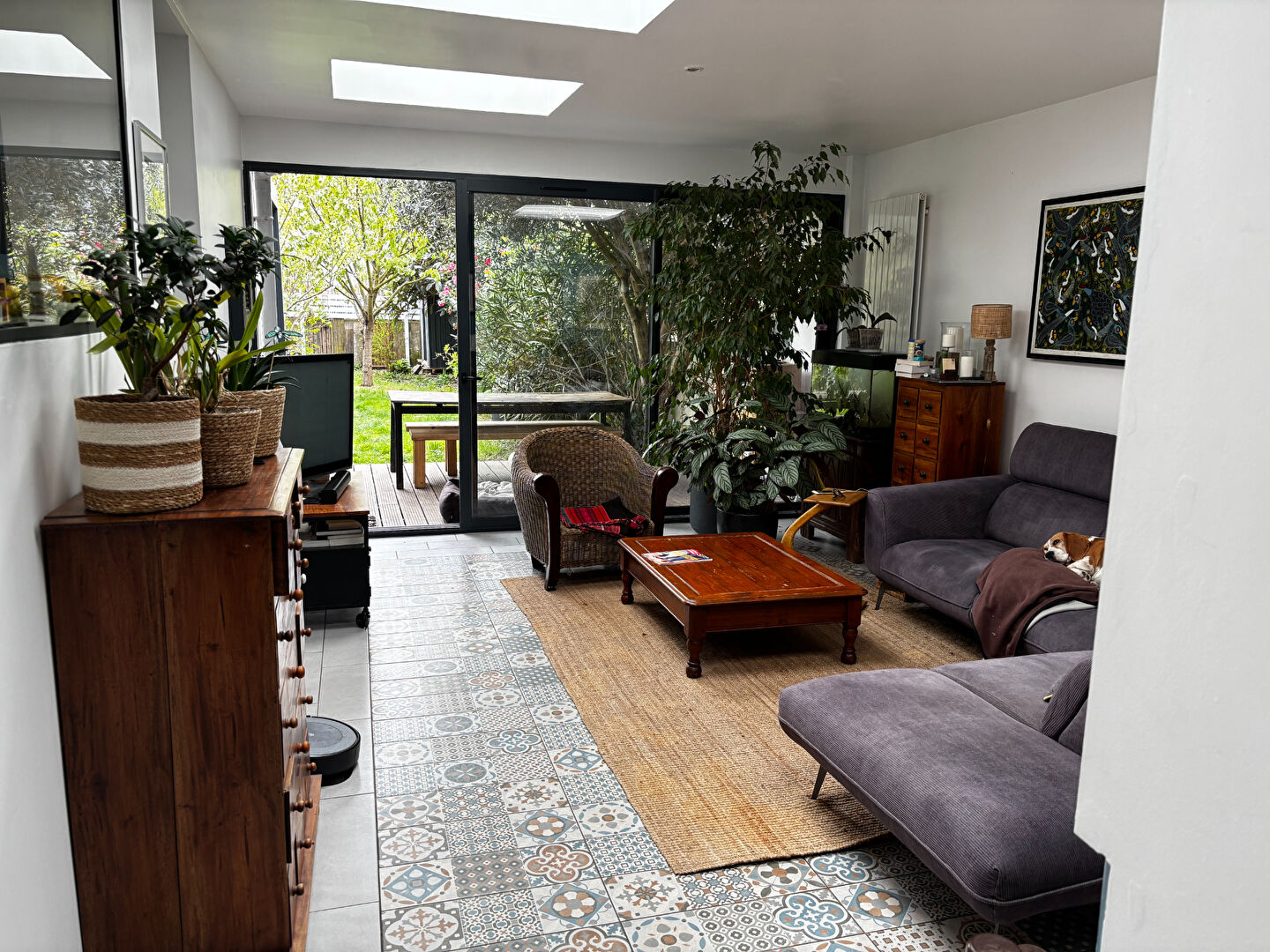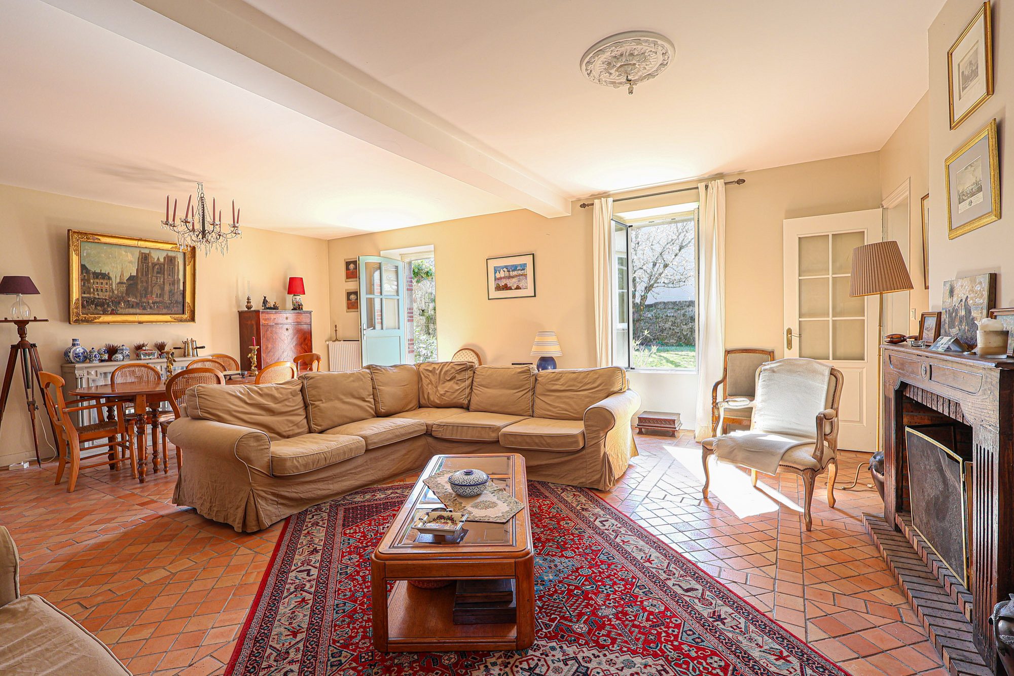 La pièce de vie, lumineuse et chaleureuse, s'ouvre de plain-pied sur une ter...