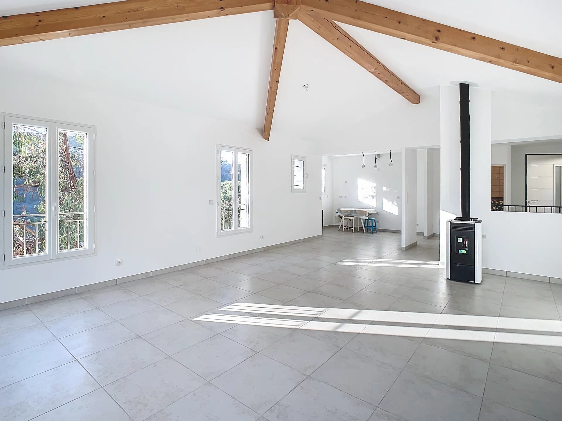 Au niveau principal, un vaste séjour cathédrale ainsi qu'une cuisine avec espace salle à manger donnent accès à une j...