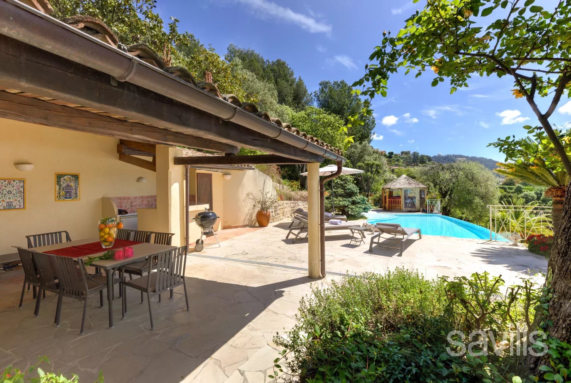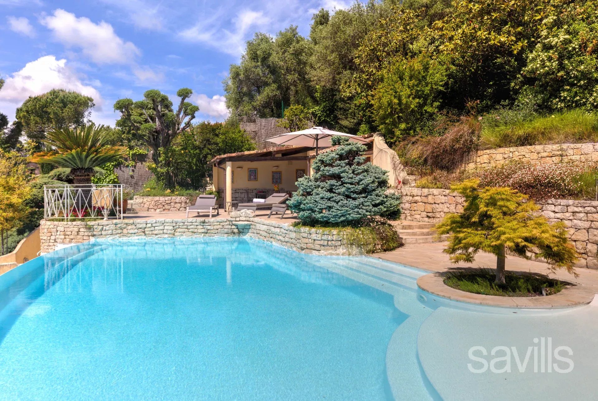 Érigée sur un terrain plat et arboré de 2200 m² elle dispose d'un jardin paysager, d'une piscine ainsi que de plusieurs terrasses.