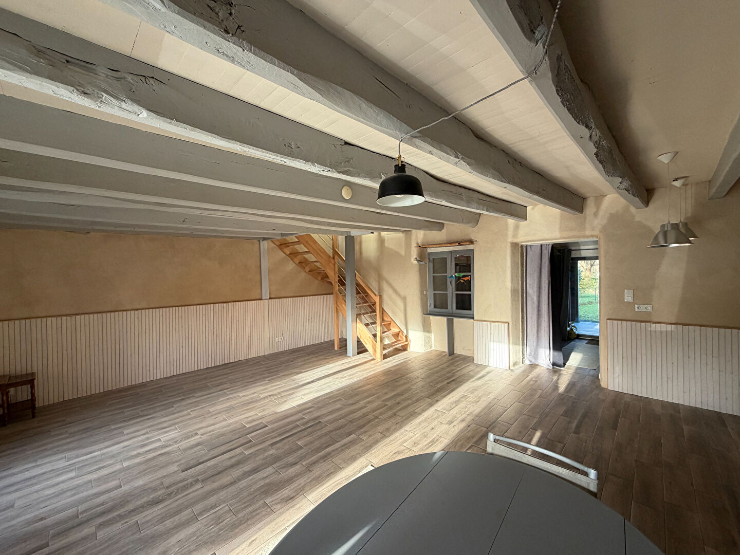 - En rez-de-chaussée : Séjour avec coin cuisine, wc...