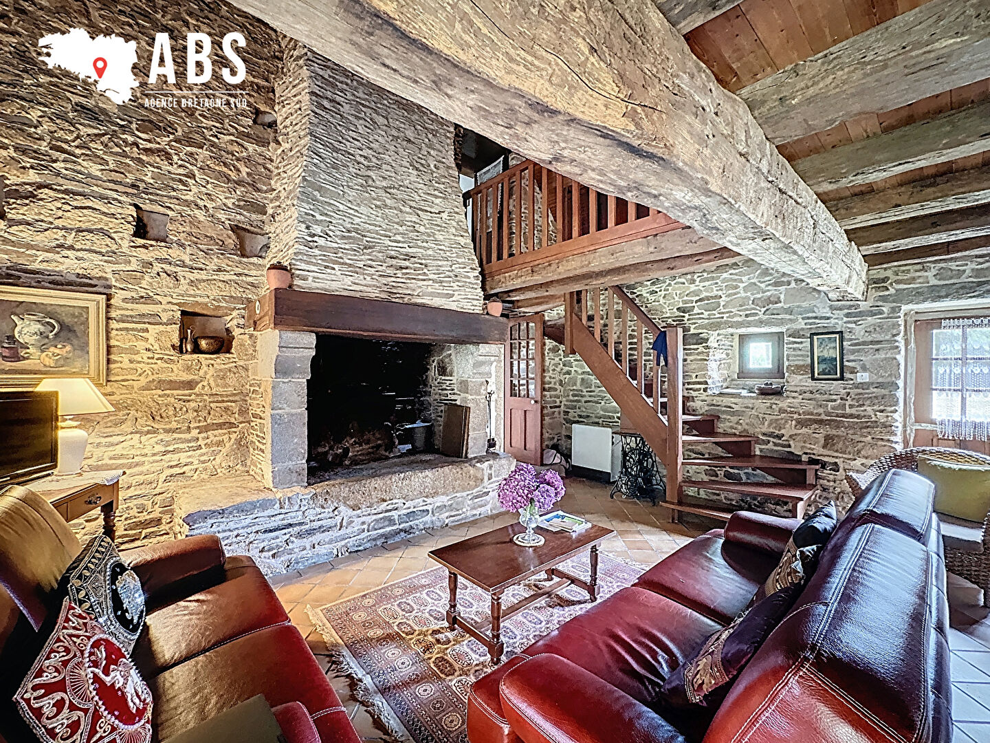 Entrée avec placard, wc, Cuisine indépendante, Séjour/Salon de 60 m2 avec cheminée (foyer ouvert), poutres apparentes, et murs pierres.