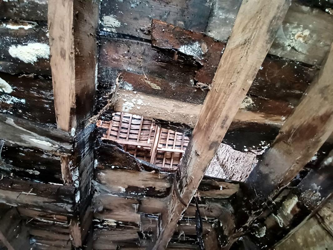 Au rez-de-chaussée : cuisine avec cheminée, dégagement, chambre, wc, salon/séjour.