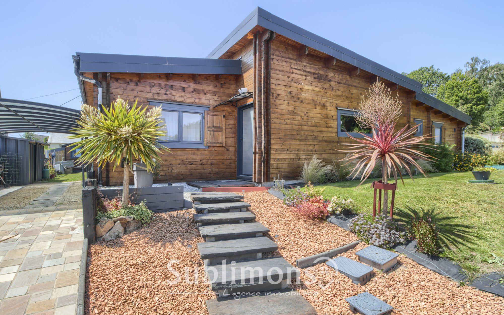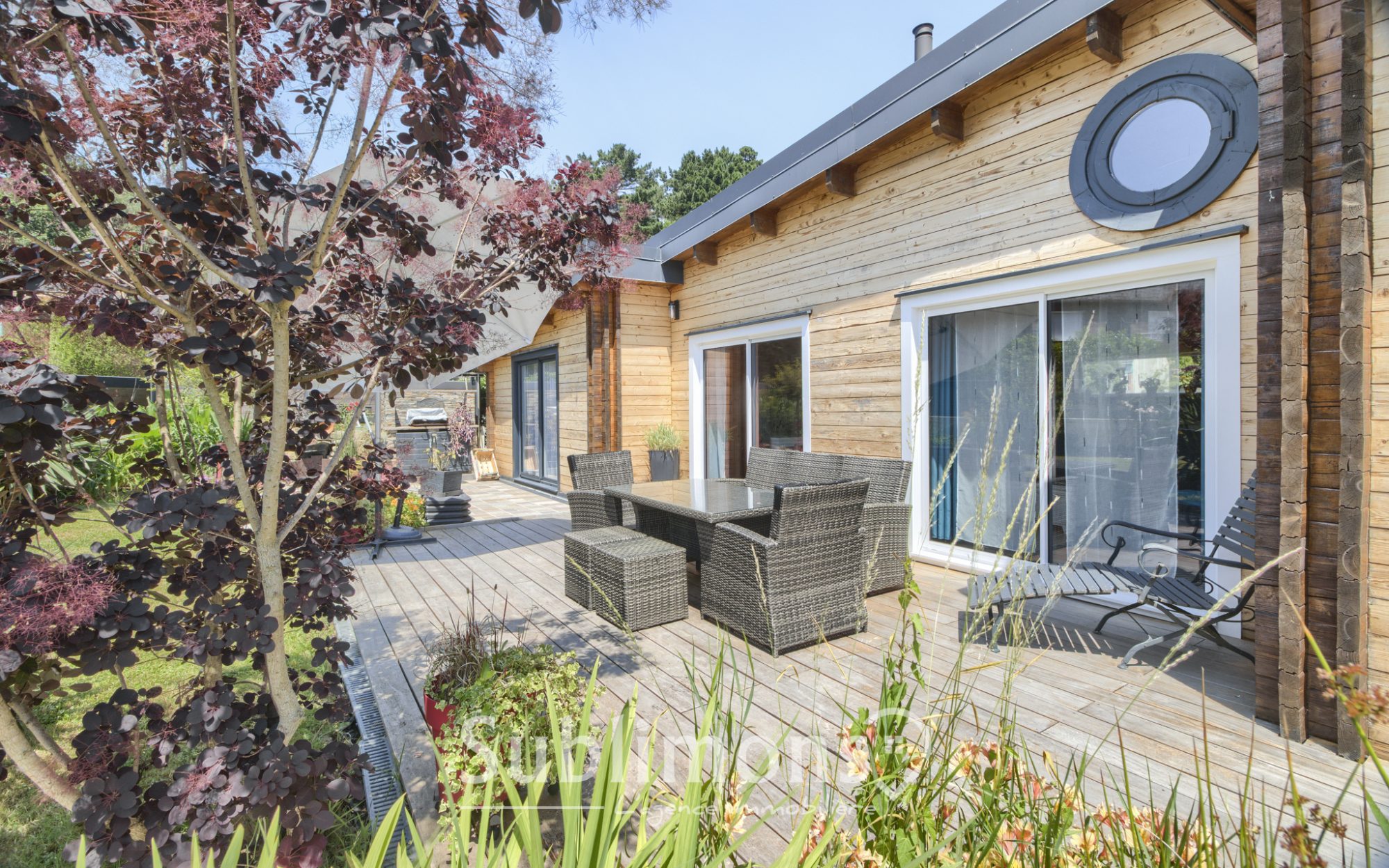 À seulement 15 minutes des plages et à proximité immédiate des commerces, écoles et grands axes, ce chalet en bois parfaitement entretenu vous offre un cadre de vie doux, chaleureux et lumineux, sur une parcelle paysagée de 440 m².
