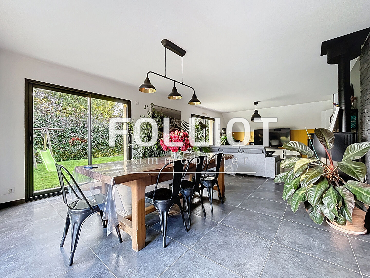 - Au rez-de-chaussée : salon avec poêle à bois, salle à manger, cuisine et séjour