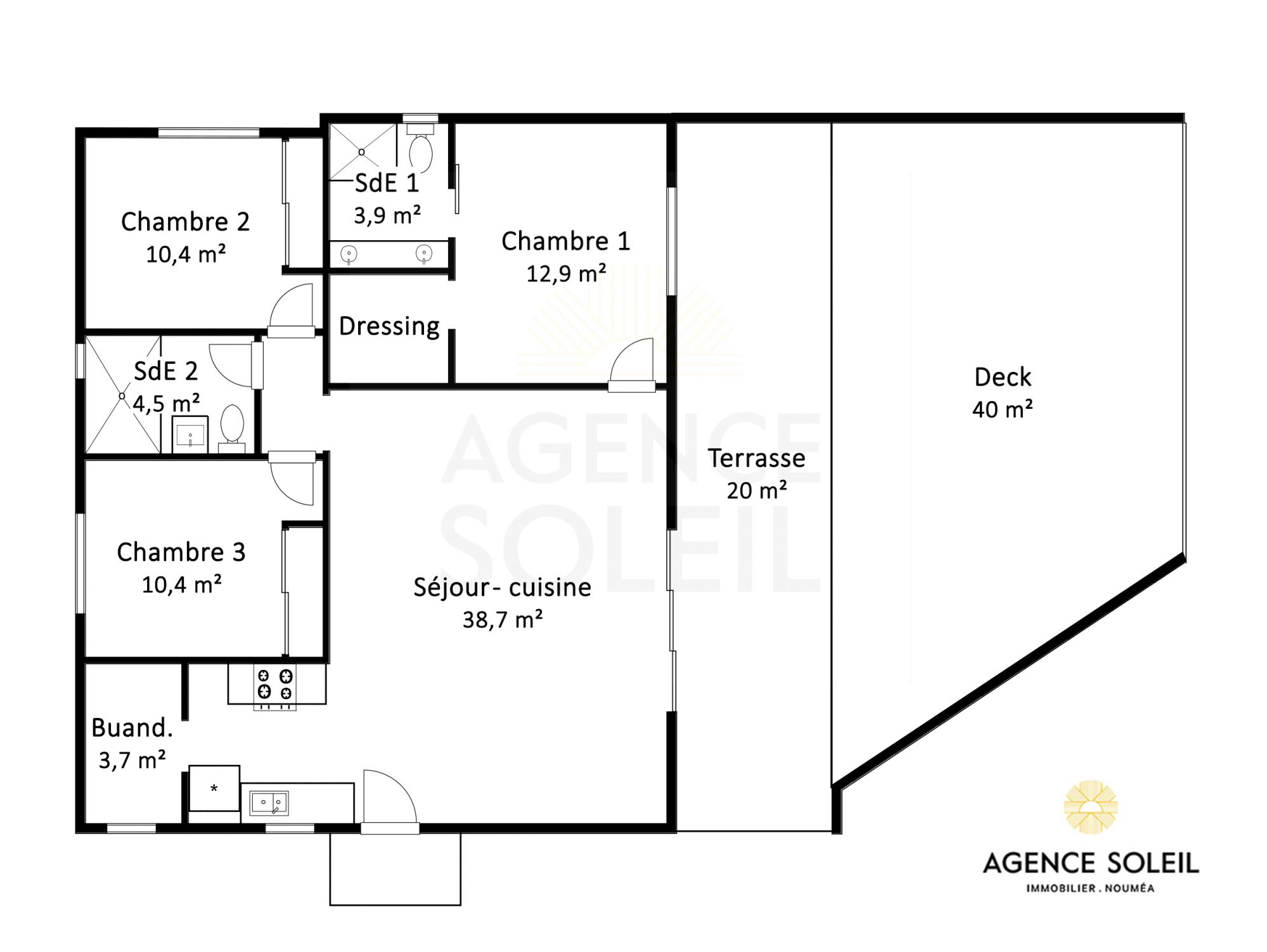 - L'espace de vie comprend un grand séjour, une cuisine américaine équipée et meublée avec de nombreux rangements et une terrasse couverte de 60 m².