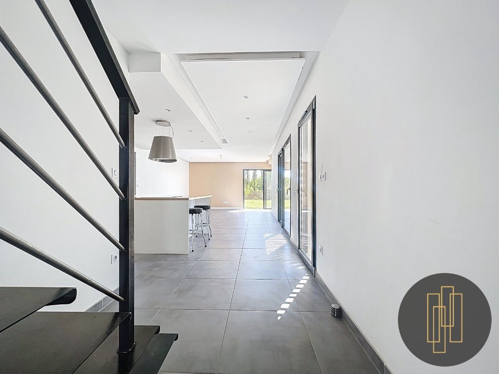 Le hall d'entrée projette une belle perspective sur la spacieuse et lumineuse pièce de vie de 50 m² équipée d'une cuis...