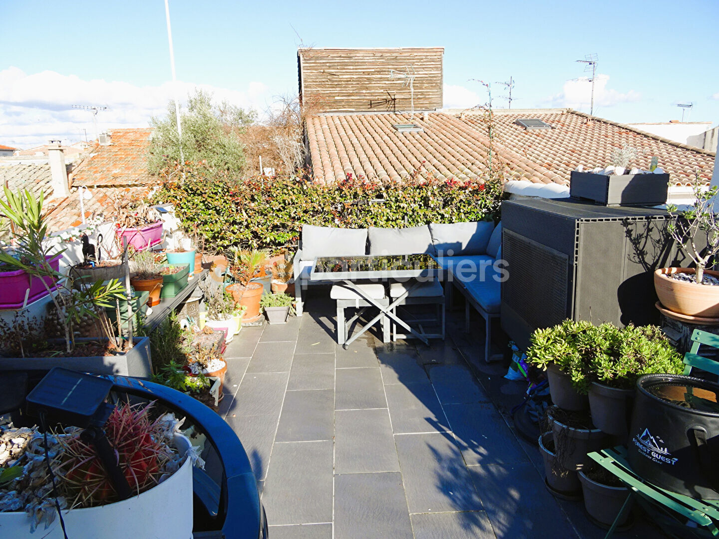 MONTPELLIER-PÉROLS - Maison de village rénovée de 76m², 3 chambres, séjour avec cuisine équipée 25m², salle d'eau, toit terrasse de 20m², garage, facilité de parking, centre-ville mais très calme. Beaucoup de charme, lumineuse, à 6 minutes à pied du tramw...