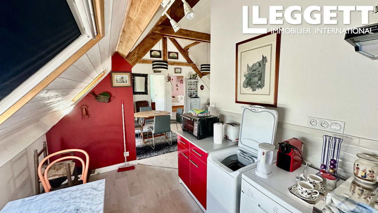 Belle pièce à vivre avec partie cuisine aménagée et séjour avec poêle à bois-