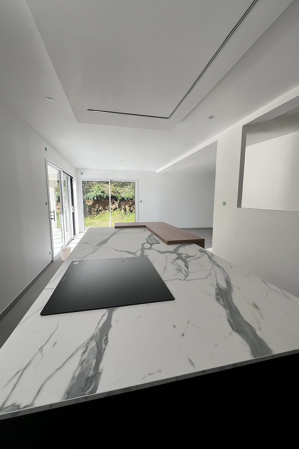 Au rez-de-chaussée, une grande pièce de vie lumineuse avec cuisine aménagée ouverte sur la terrasse.