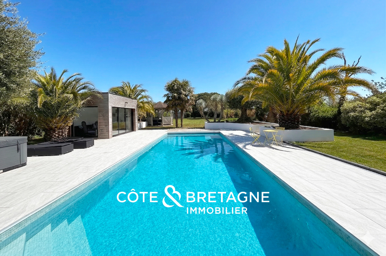 EXCLUSIVITÉ SBI, A VENDRE, PORDIC entre bourg et plage, superbe maison contemporaine de 2005 (214m2 habitables) sur 3065m2 de terrain clos et entièrement paysager avec piscine extérieure chauffée, comprenant : salon/salle à manger avec cheminée, salon TV, cuis...