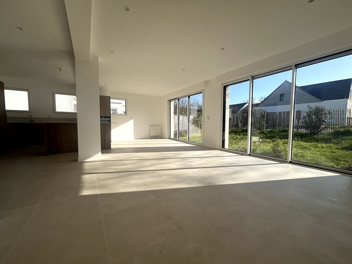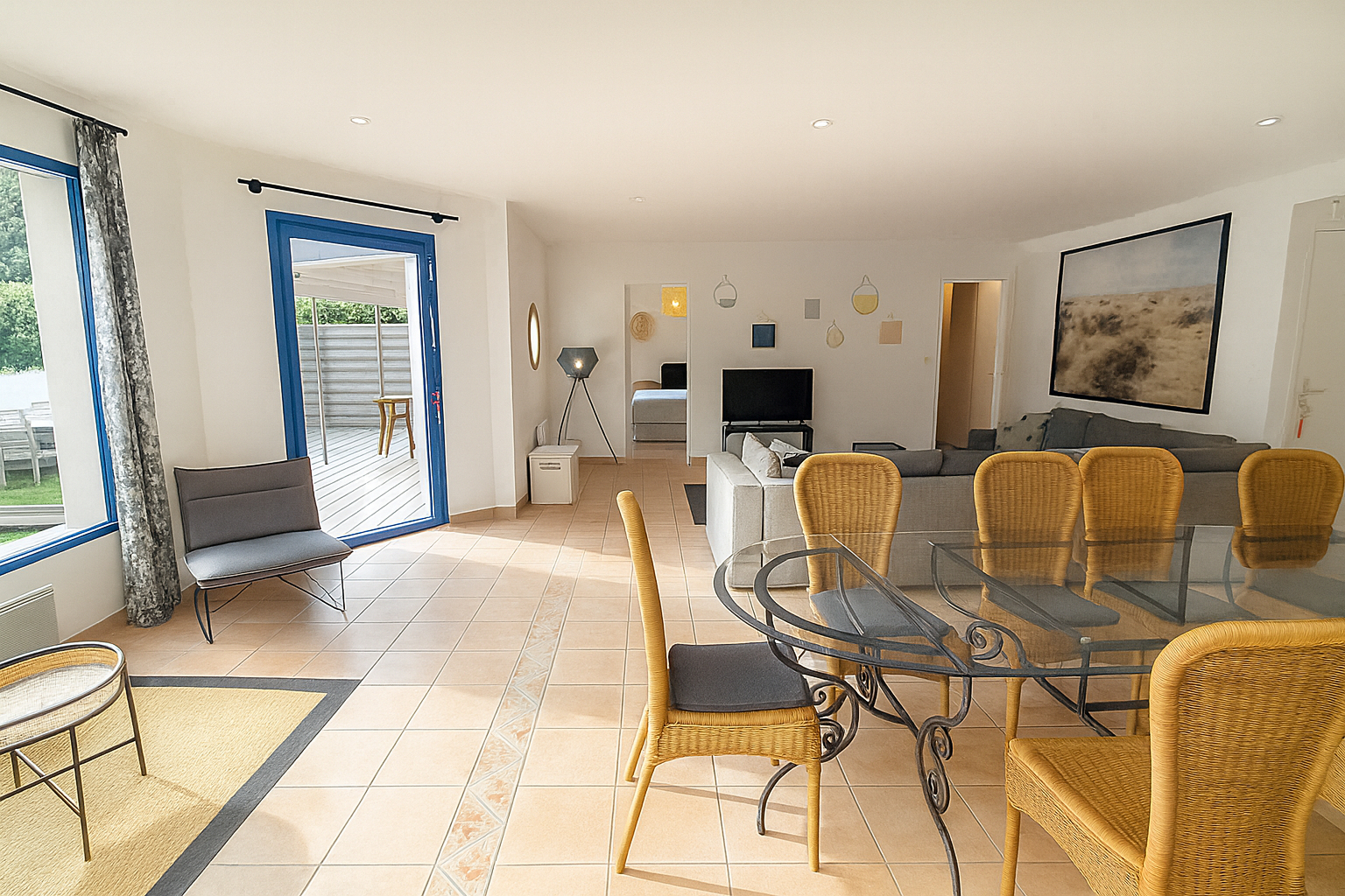 Hall, salon séjour lumineux donnant sur terrasse avec cuisine ouverte, b...