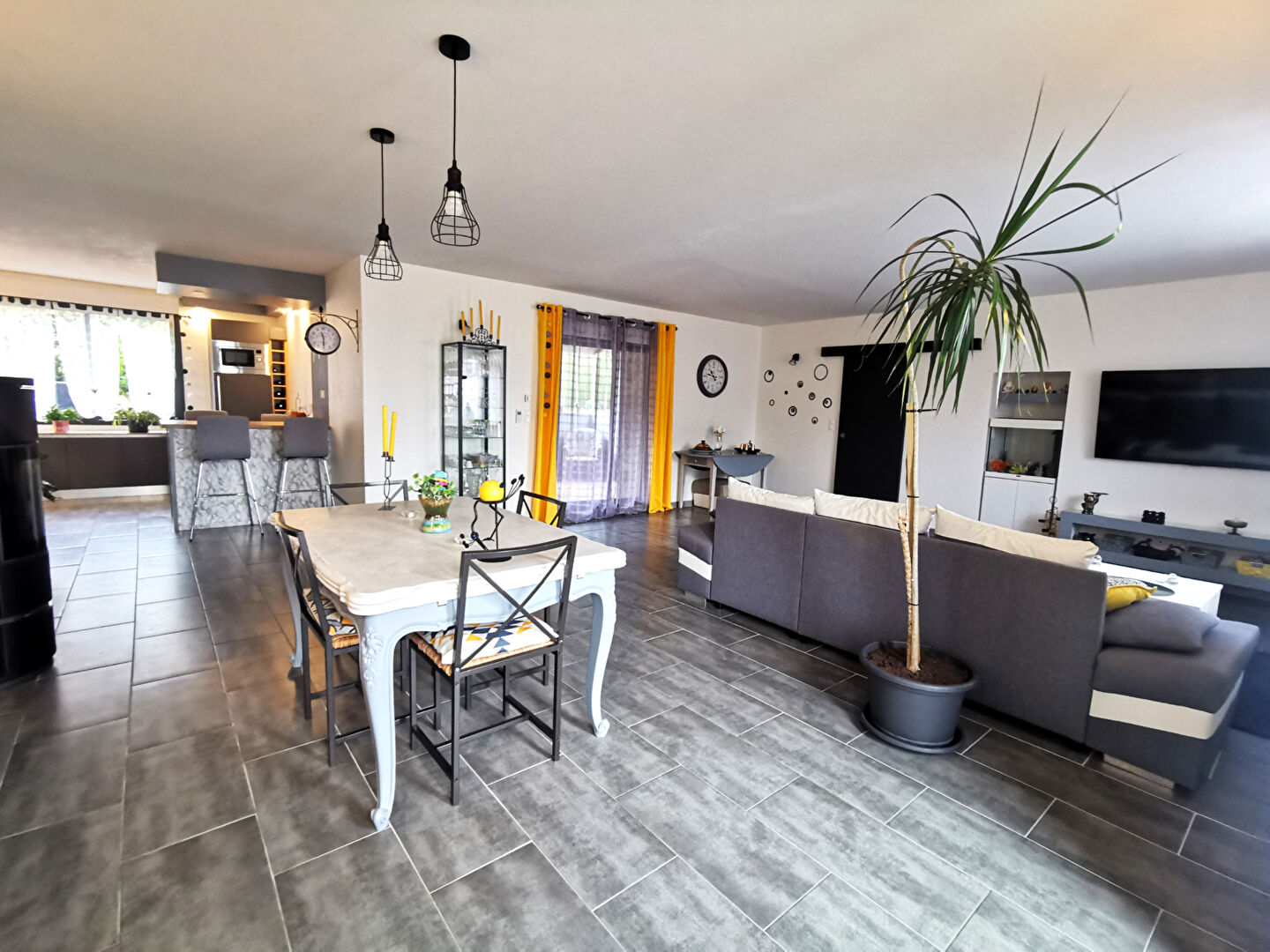 Vous entrez dans un salon séjour lumineux avec poêle a granulés, une cuisine ouverte aménagée et équipée, une buanderie ainsi qu'un dégagement qui dessert une suite parentale avec une salle ...