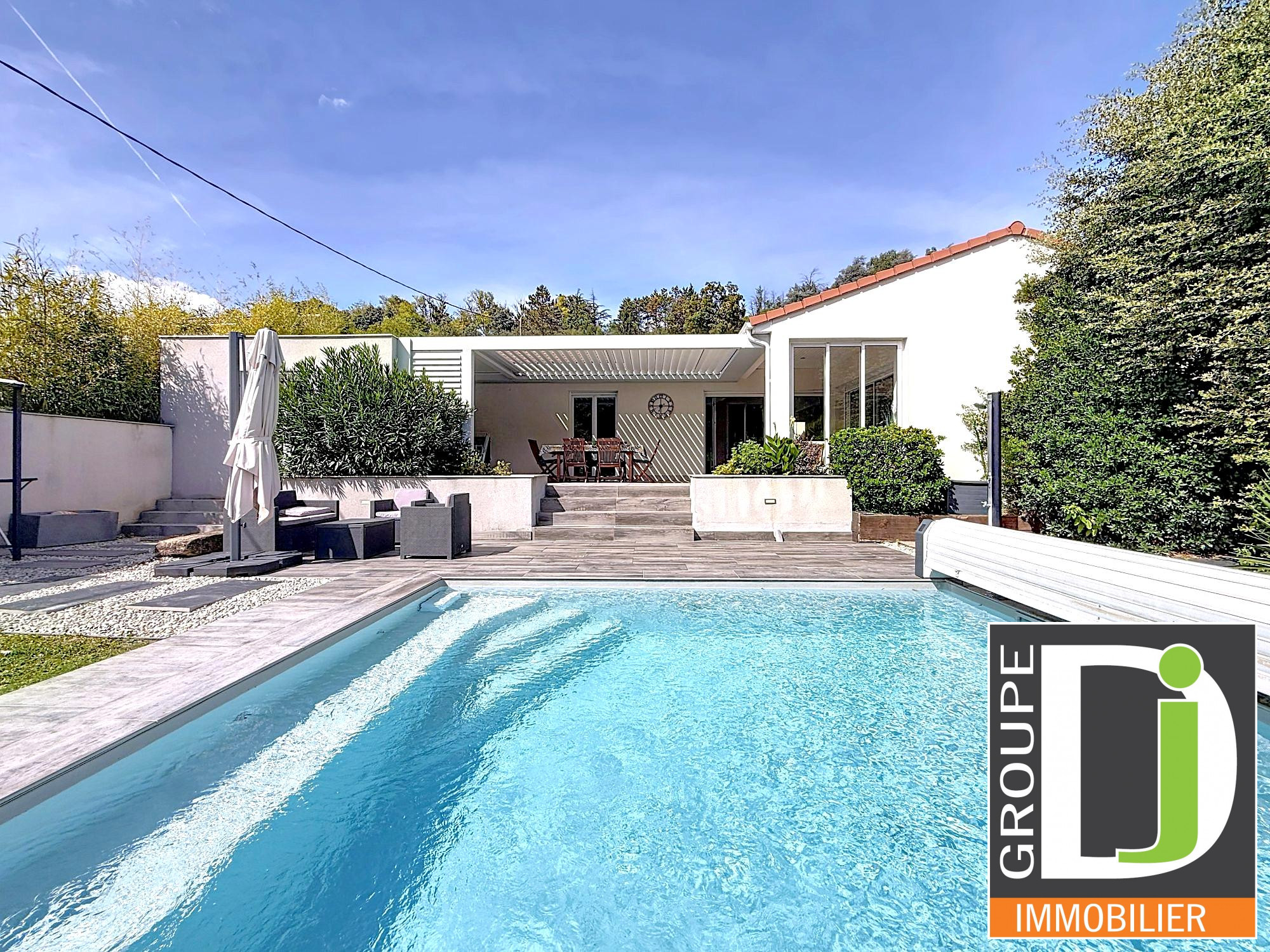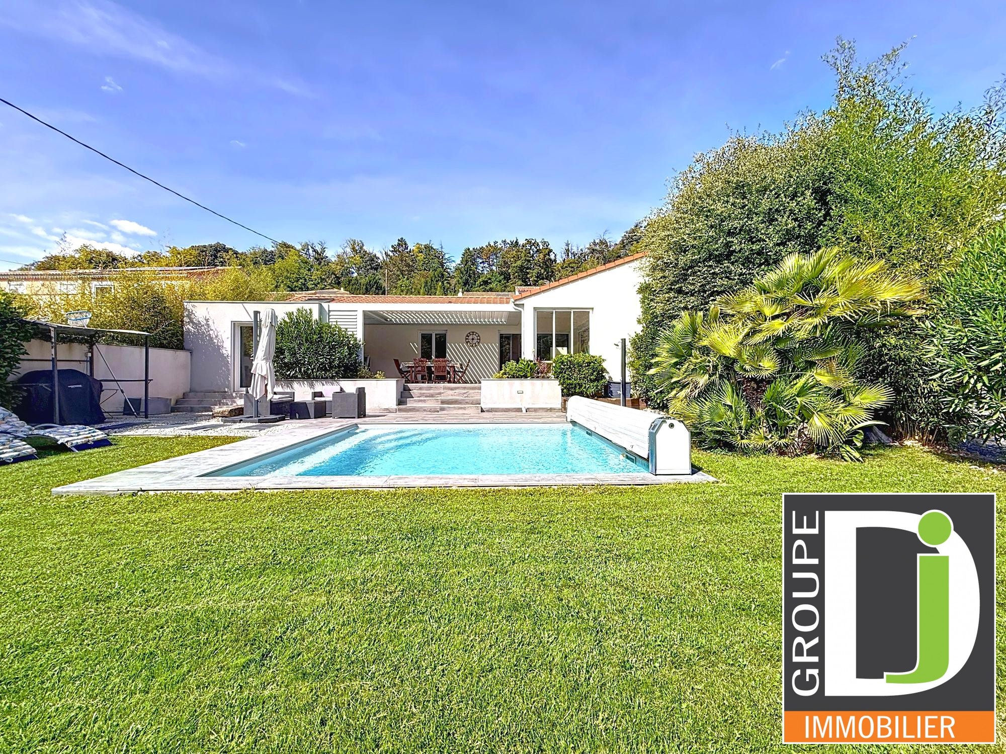 Charmante villa de plain-pied de 128 m², implantée sur un terrain paysagé de 1 090 m² avec piscine chauffée (2022, sous garantie, au clore avec bâche sécurisée).