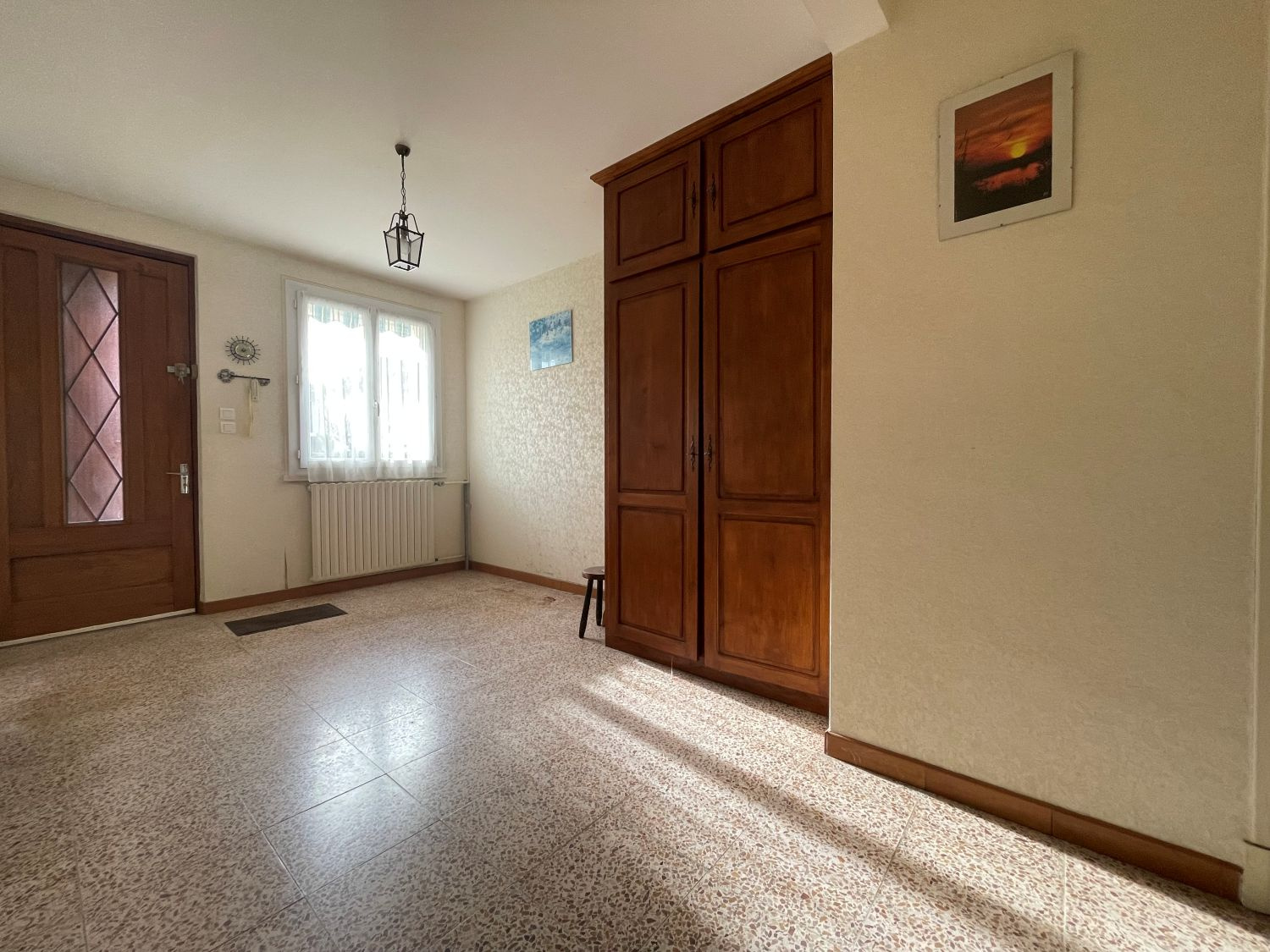 La maison est composée au rez-de-chausséee d'une entrée avec placards, belle piéce de vie , cuisine ouverte sur salon-salle à manger avec cheminée pierres.