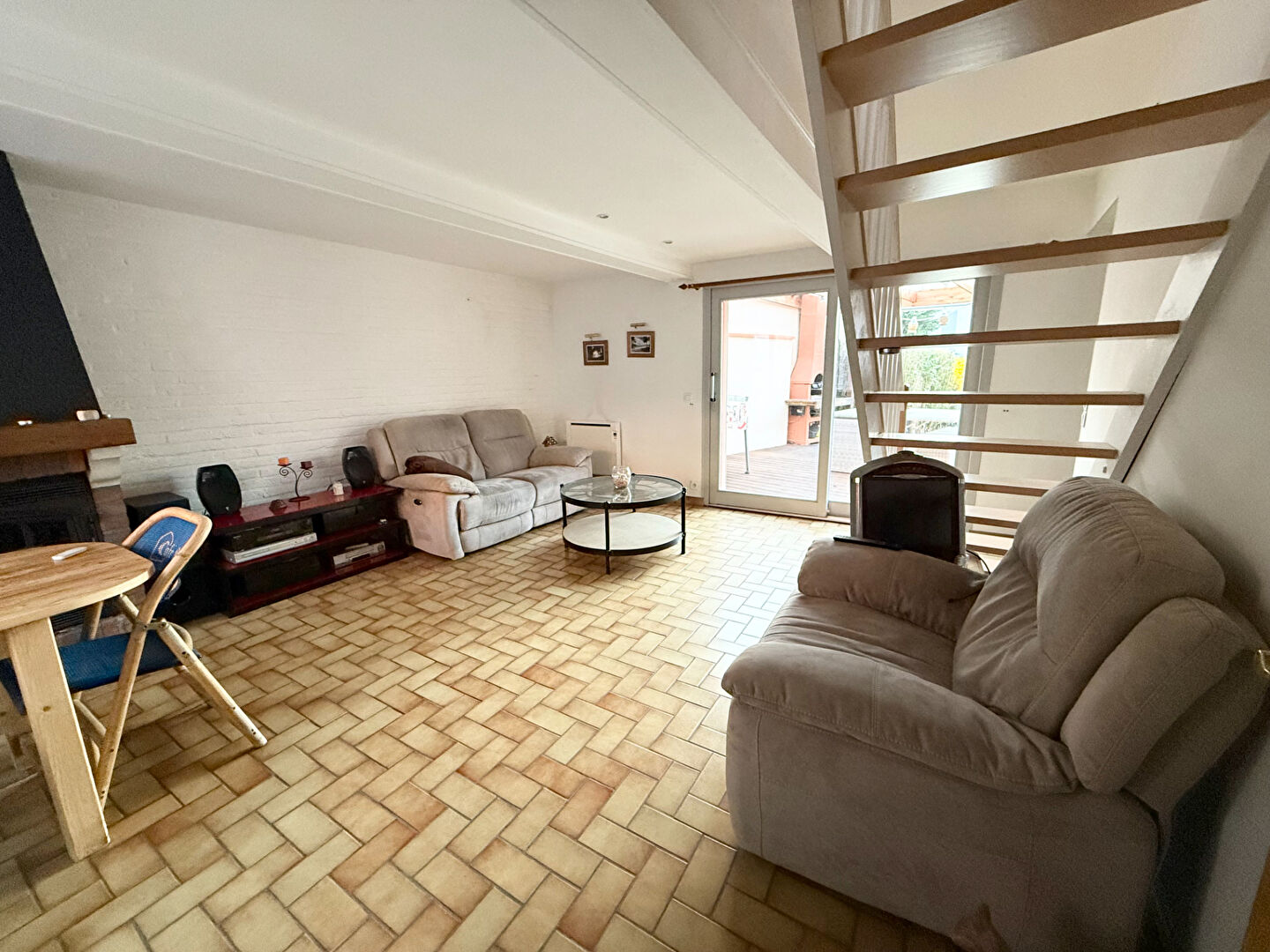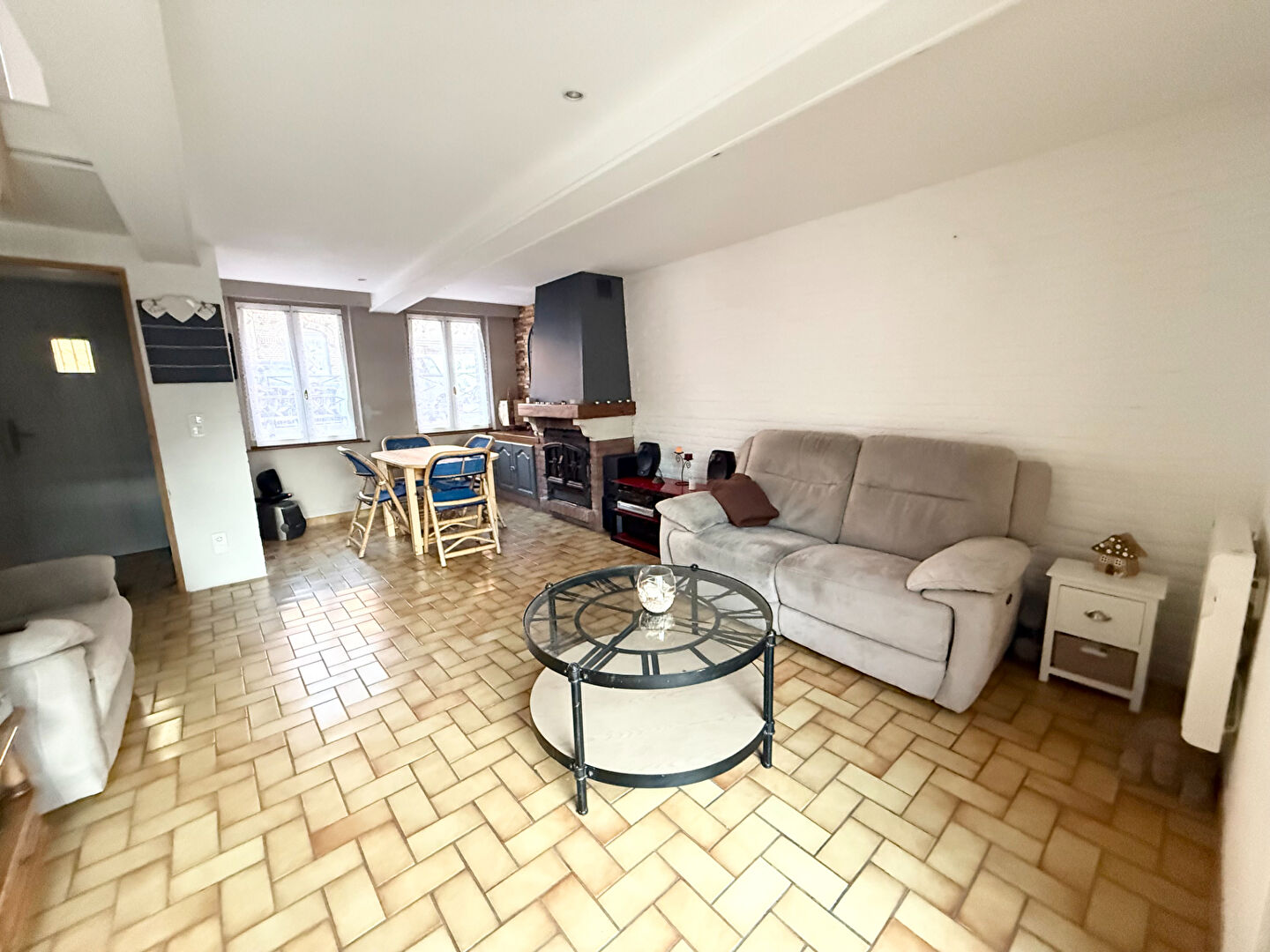 En rez-de-chaussée, un séjour de près de 25m² avec sa cheminée insert feu de bois. Une cuisine équipée et fonctionnelle. Une chambre ainsi qu'une salle de bain avec dou...
