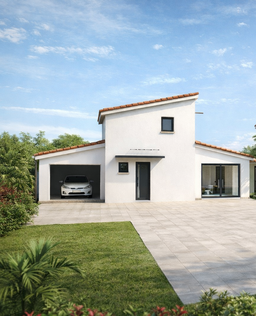 Je suis une belle villa T4 de standing, en cours de construction. Je mesure environ 106 m2 habitables sur une parcelle de 346 m2.