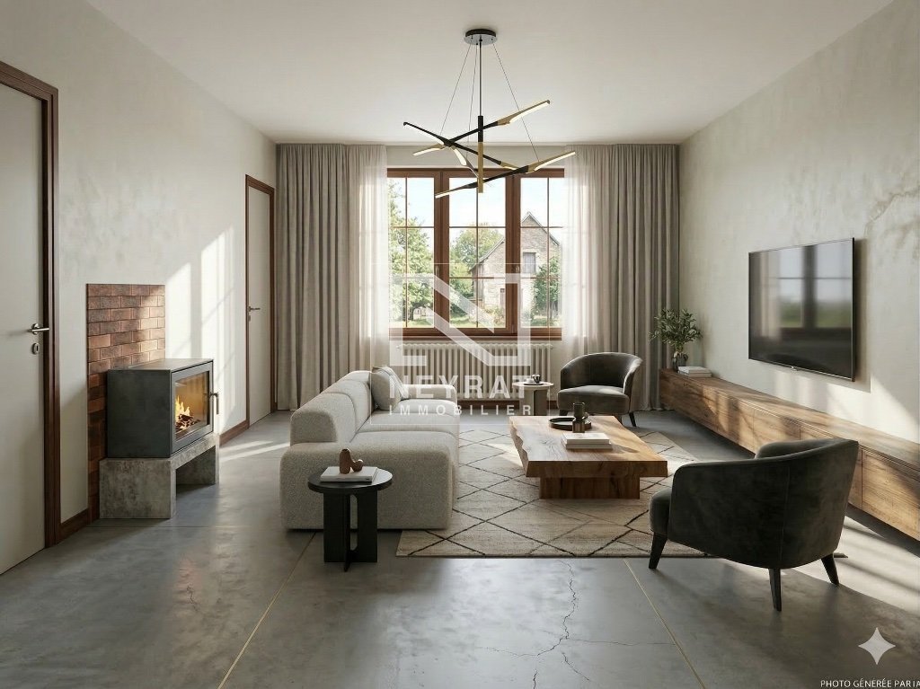 Le rez-de-chaussée se compose d'une véranda, d'une entrée avec couloir, d'une cuisine, d'un vaste séjou...