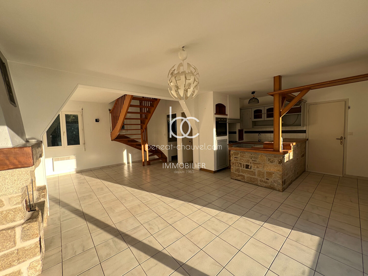 Hall - Séjour/Salon de 48m² donnant sur terrasse en bois - Cuisine américaine équipée ...