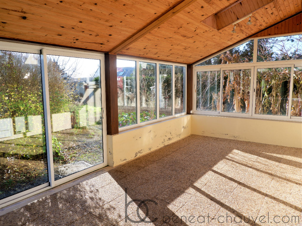 SARZEAU, Proximité immédiate bourg, maison des années 85. Comprenant au rez-de-chaussée: entrée avec placards, séjour/salon avec cheminée, véranda, cuisine équipée et aménagée, WC, salle d'eau, une chambre.