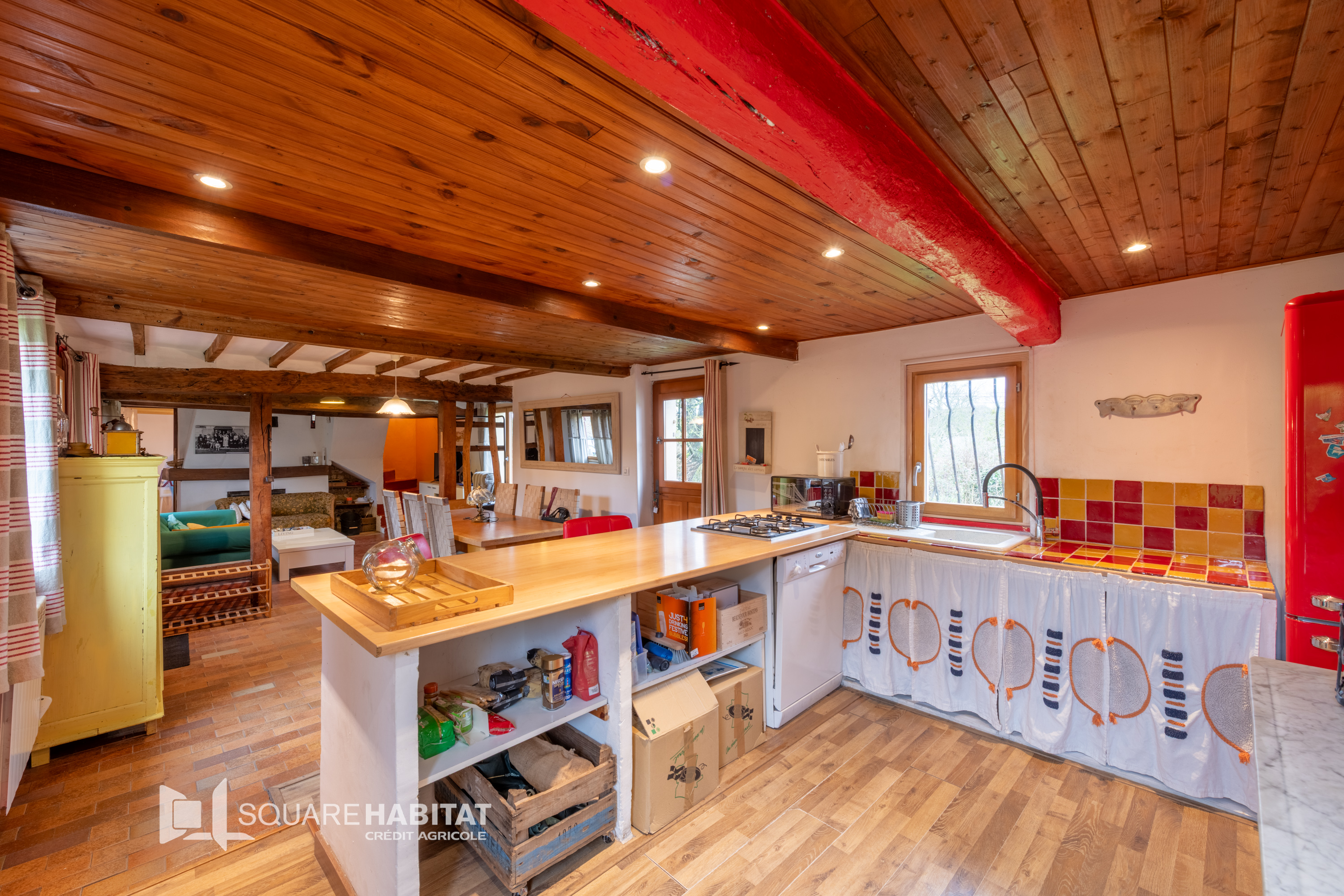 Cuisine ouverte sur le grand séjour de 32m2 avec cheminée( insert ), 2 chambres , Une salle d'eau et un WC.