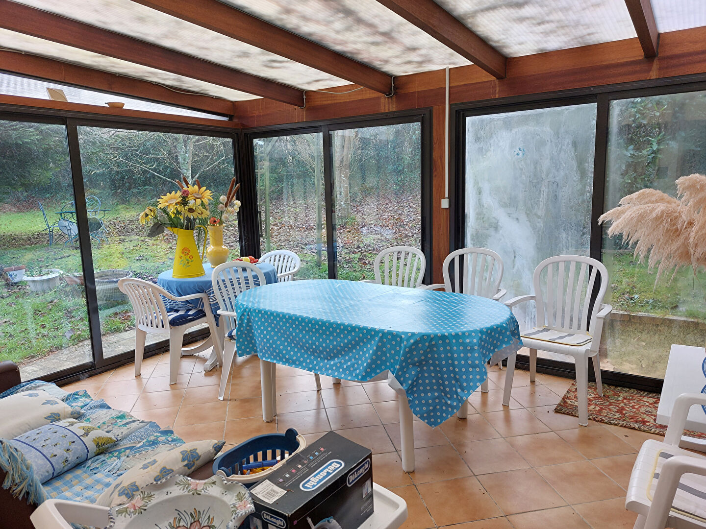 Divisée en entrée dans cuisine, salle à manger, salon, véranda, salle de bains avec WC et chambre.