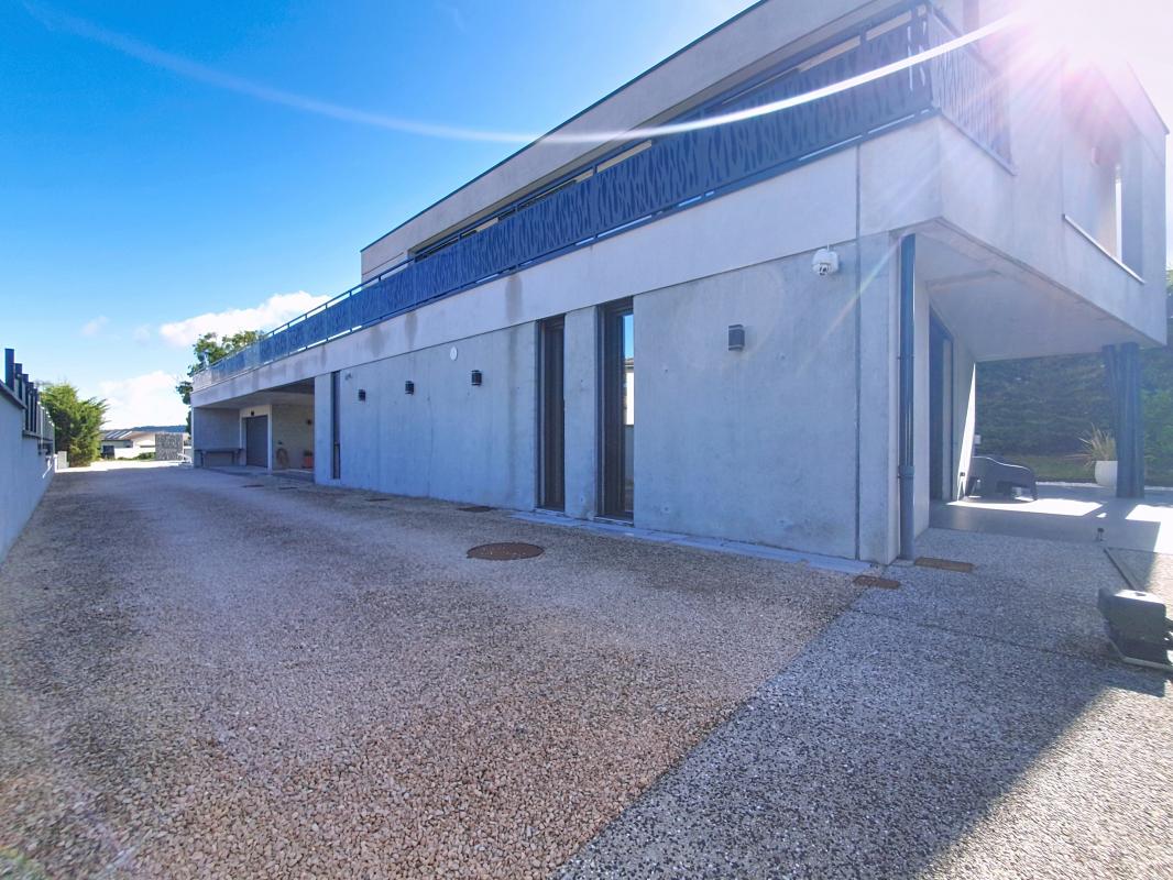 SEYSSUEL, en sortie du village, villa d'architecte aux volumes atypiques, des années 80, d'une surface de plus de 200 m2 pour la demeure principale, avec une belle entrée donnant sur une pièce à vivre cathédrale, avec un espace salon et un séjour, de...