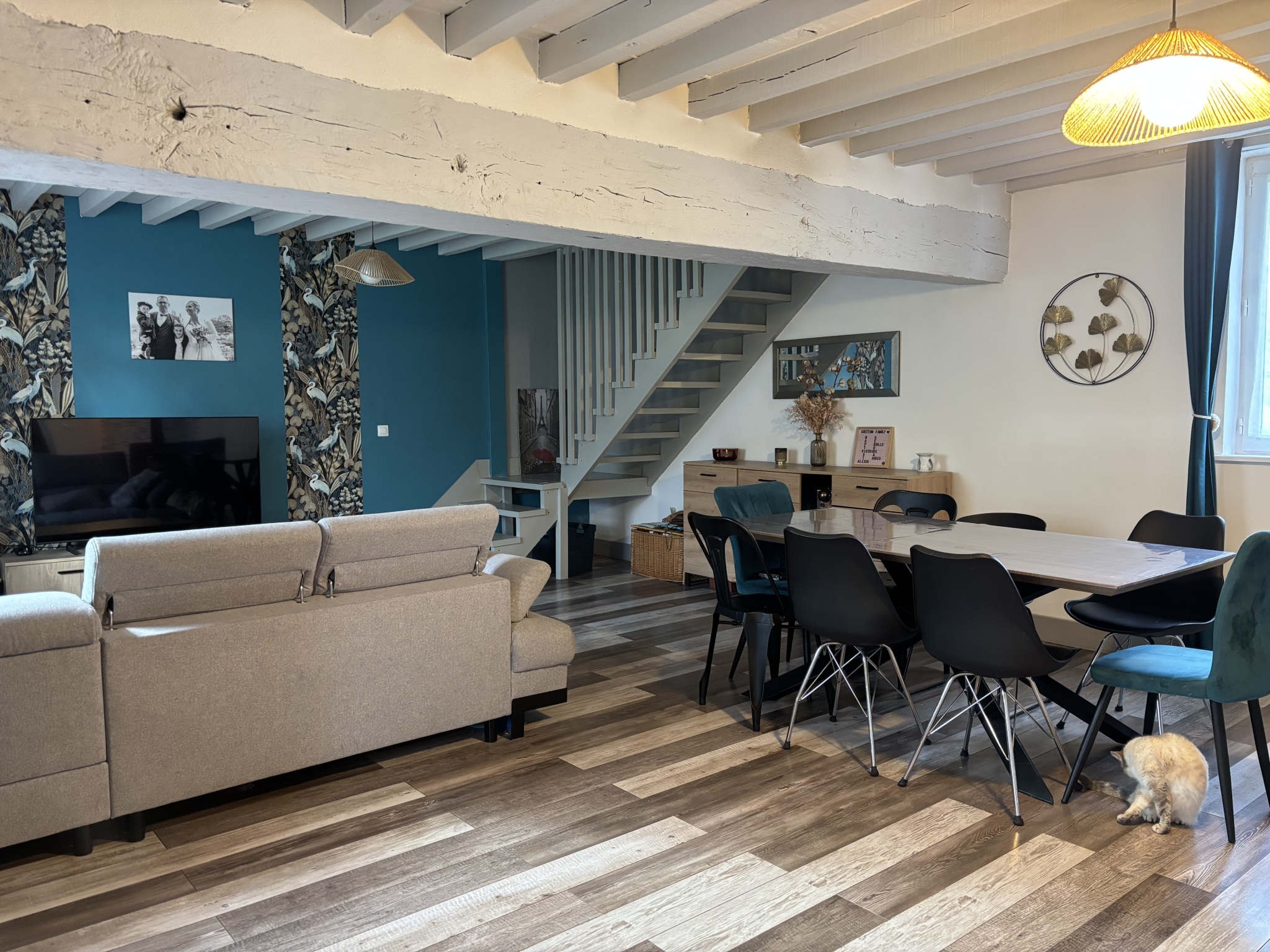 À proximité d'un village avec commerces et école, cette maison à étage rénovée offre de beaux volumes. Au rez-de-chaussée : vaste séjour-salon d'environ 40 m2 avec poêle à bois, cuisine récente aménagée et équipée, salle d'eau avec WC, ainsi qu&...
