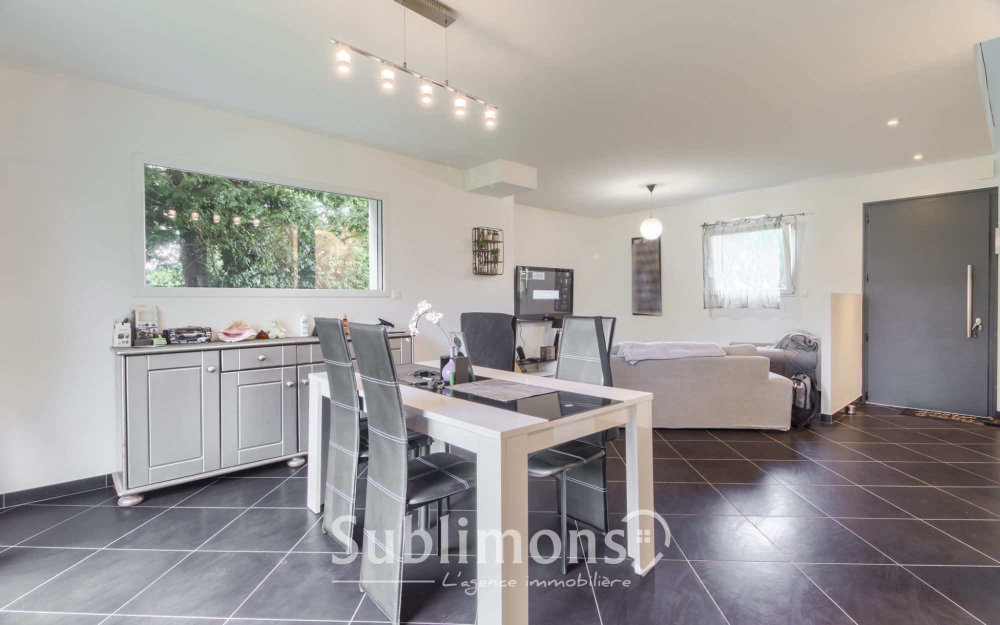 Au rez-de-chaussée : Spacieux salon/séjour avec cheminée et cuisine donnant sur terrasse.