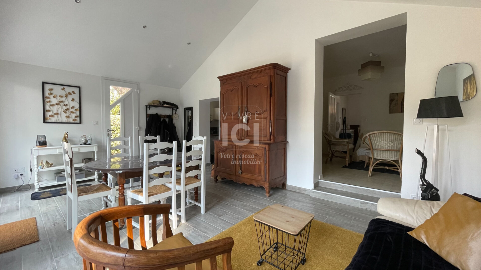 A 850m de la plage, maison de plain-pied d'environ 140m² offrant une cuisine A/E ouverte sur une très belle et grande pièce de vie avec poêle à pellets, une véranda, une salle d'eau, un wc, une buanderie, deux chambres et une suite parentale avec dre...