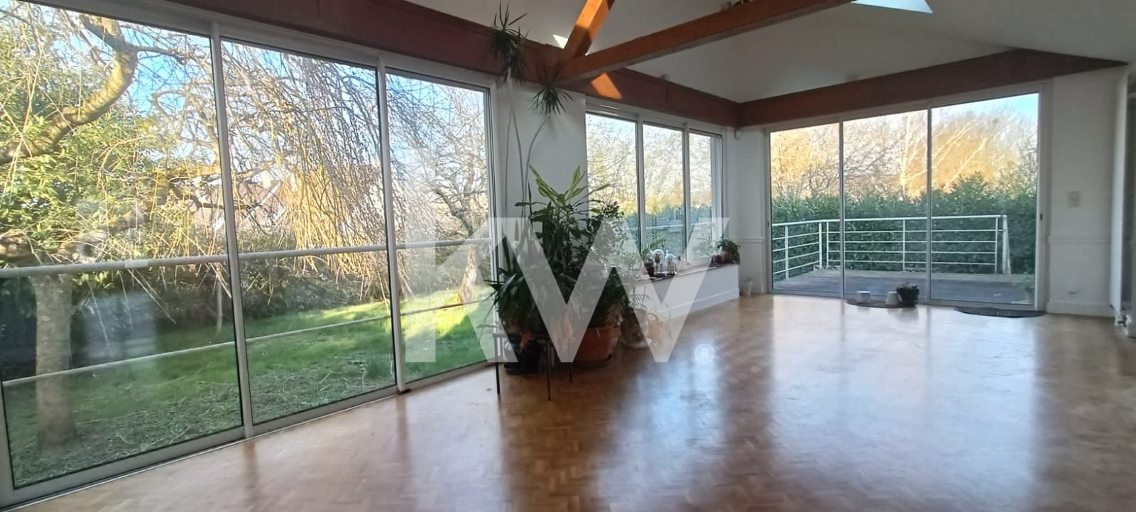 Située dans un cadre calme et verdoyant, cette spacieuse maison familiale offre un grand terrain arboré de plus de 1 000 m², idéal pour profiter de la nature en toute intimité.