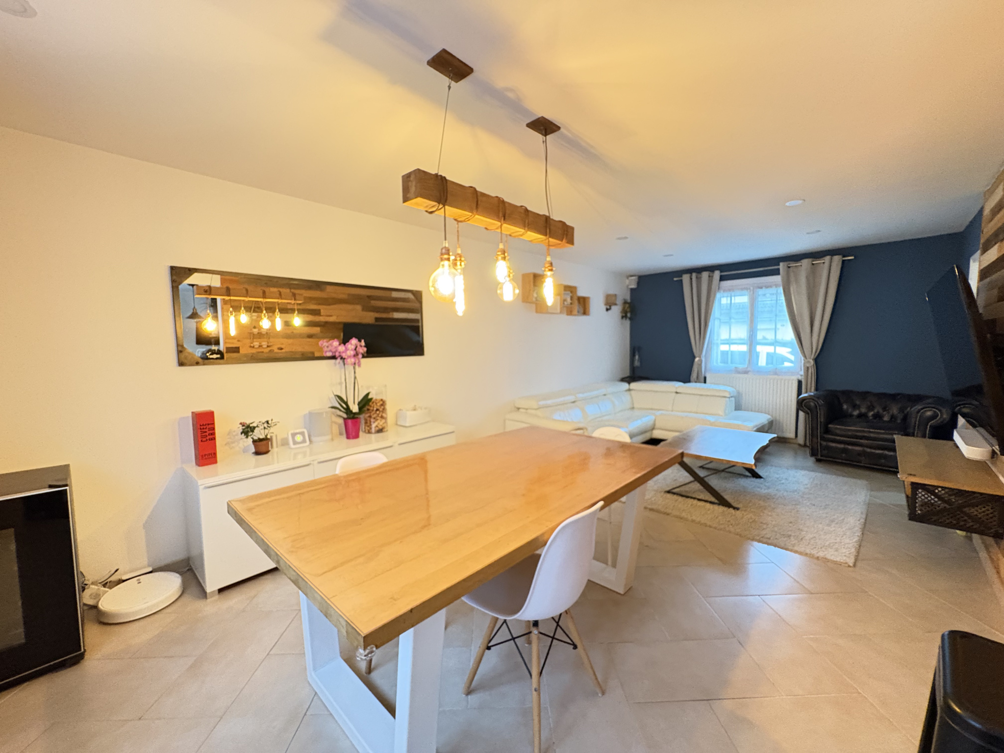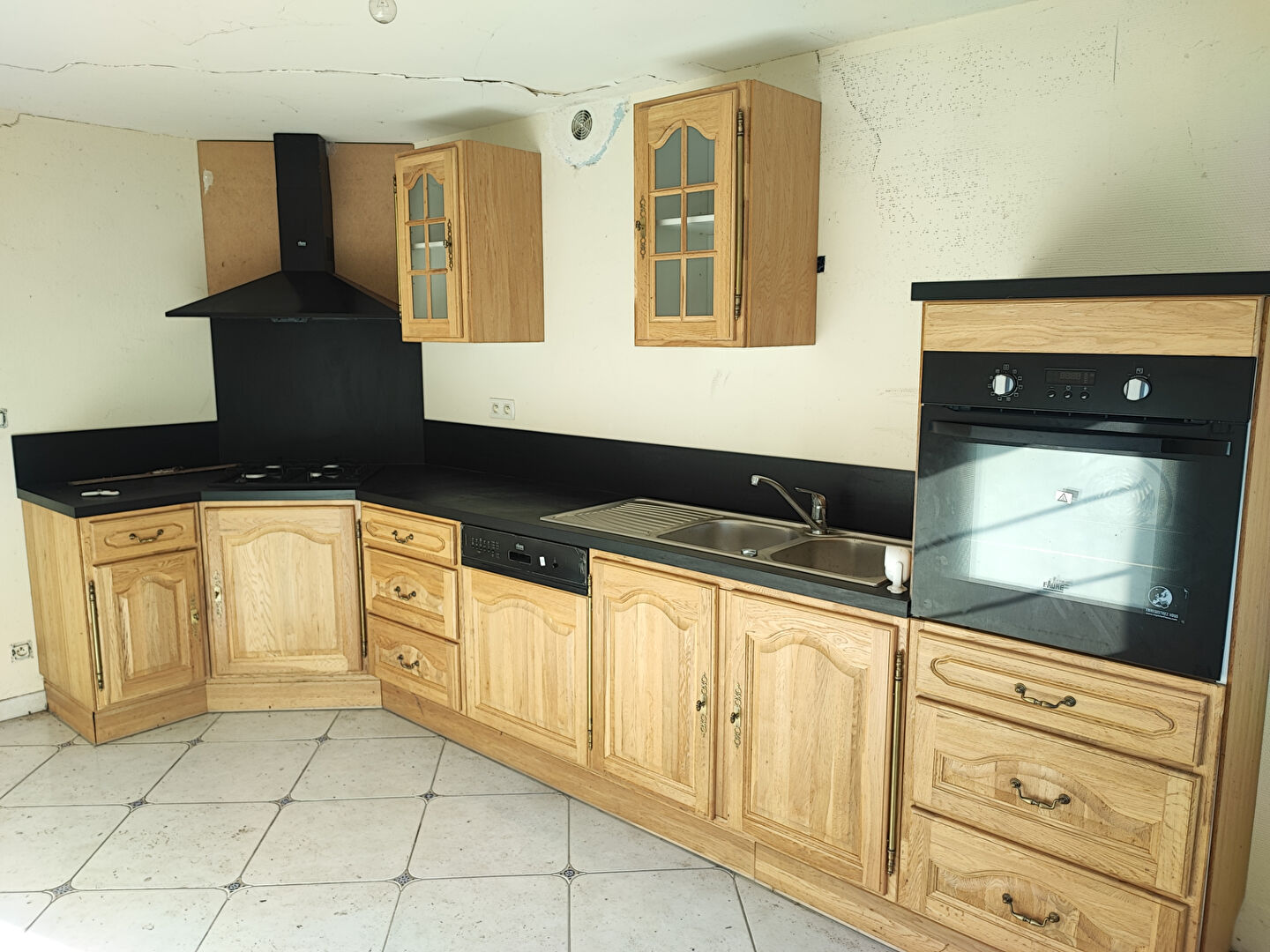 Belle pièce de vie de plus de 28 m² avec cheminée insert, cuisine aménagée/équipée, 3 chambres, une salle de bains, WC.