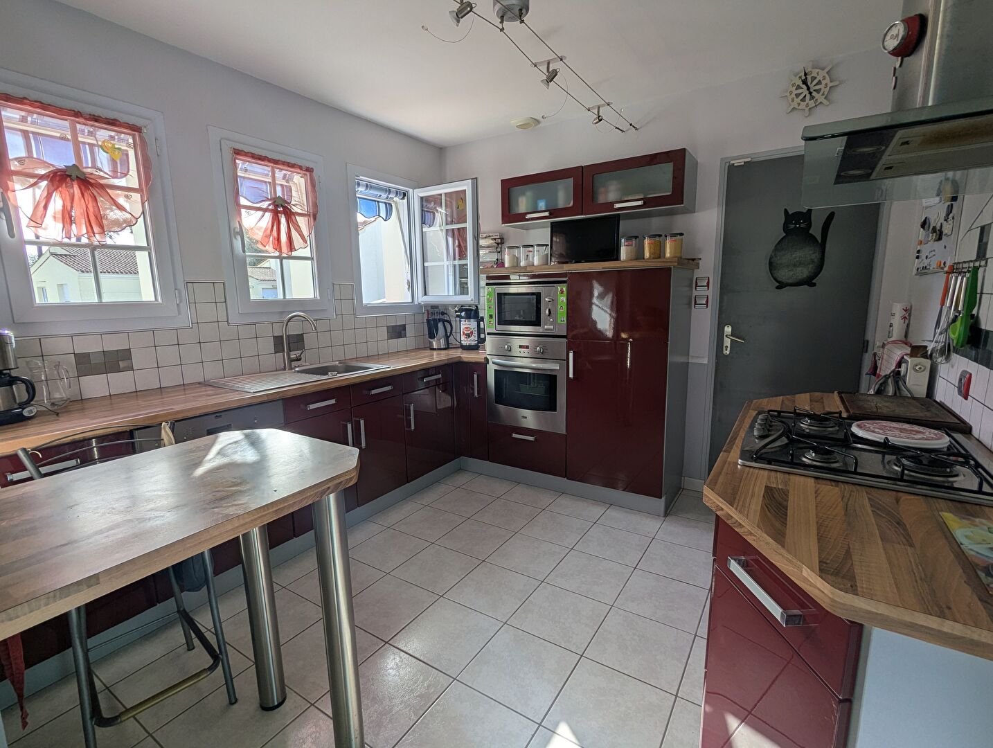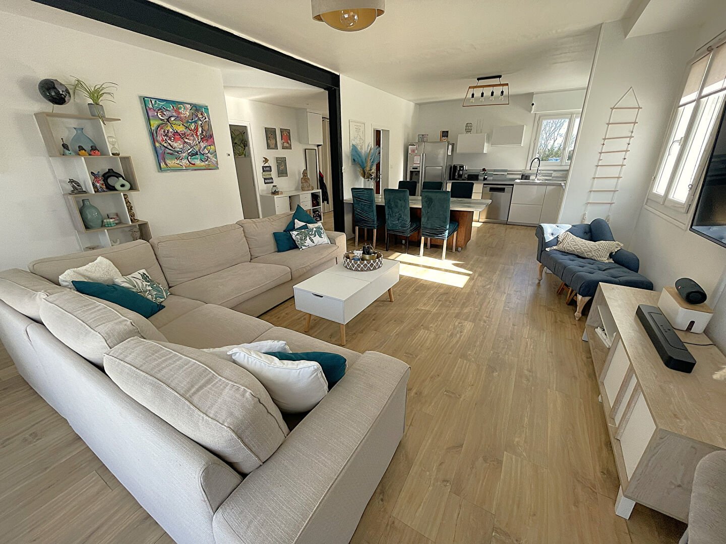 A 3 km de l'océan, Maison chaleureuse rénovée. De Plain-pied, vous profitez d'une belle pièce de vie ouverte sur une cuisine aménagée et équipée. 4 chambres, un bureau.