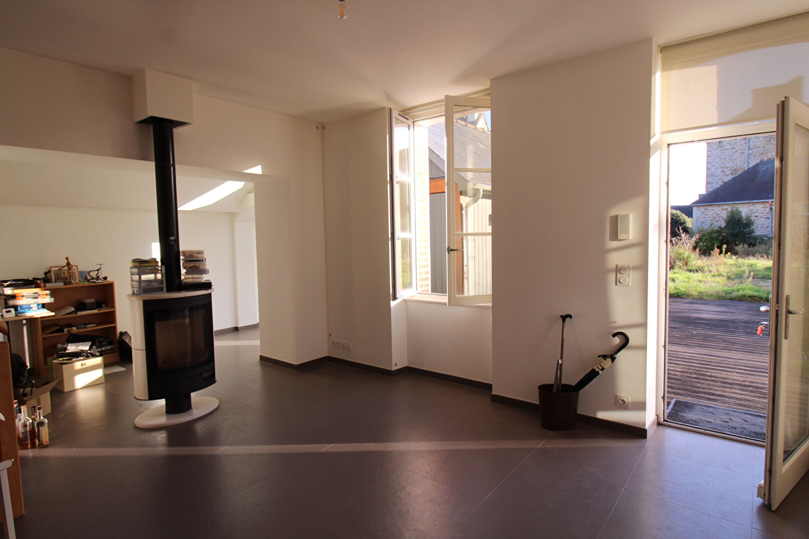 entrée, séjour / salon avec poêle à bois, cuisine aménagée, chambre, sal...