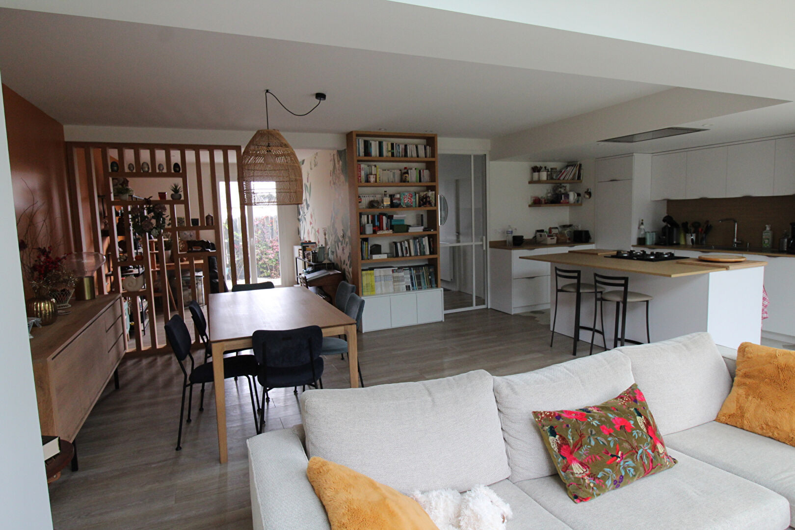 Elle se compose au RDC du séjour qui donne d 'un côté sur la cuisine ouvert...