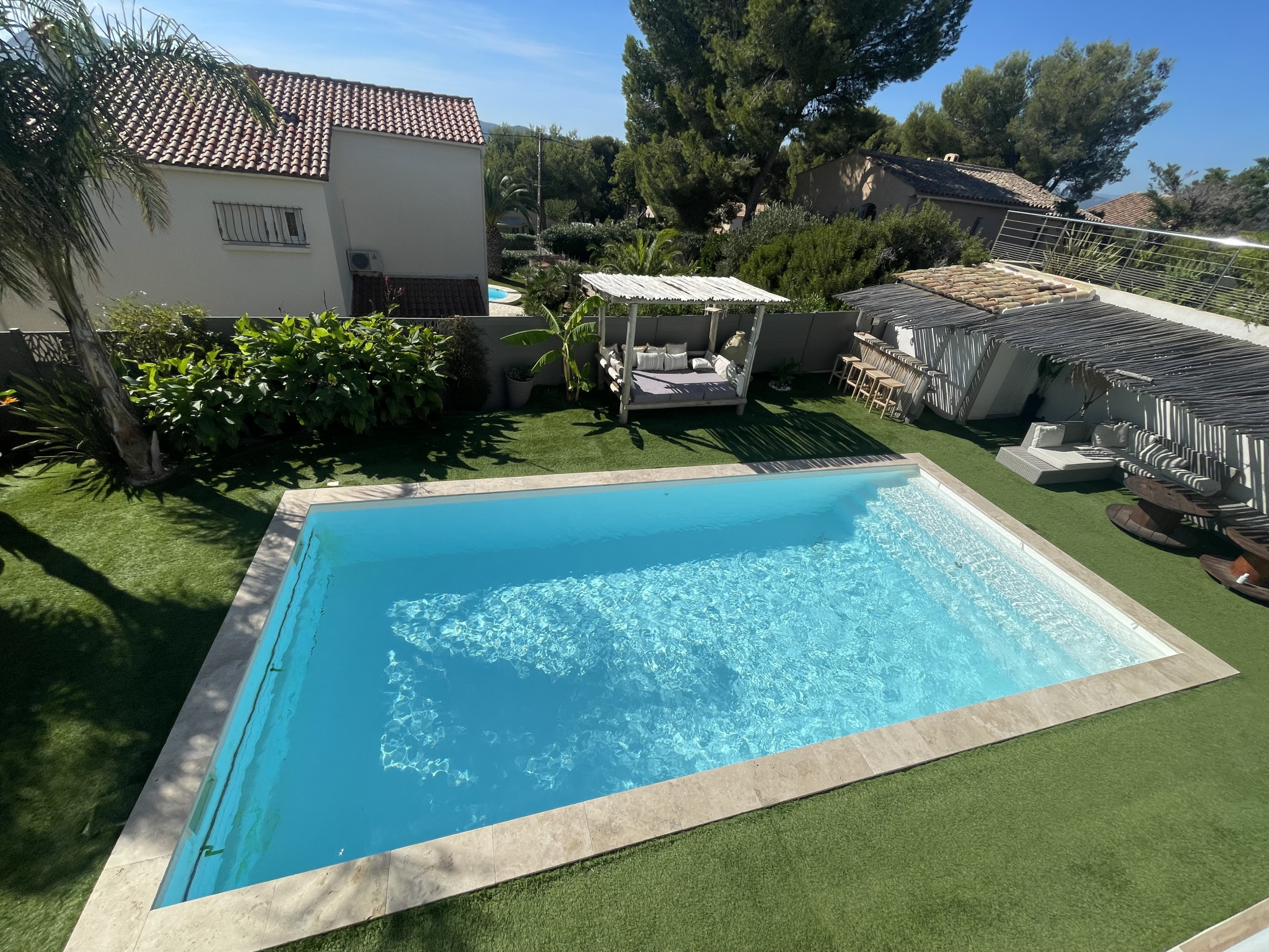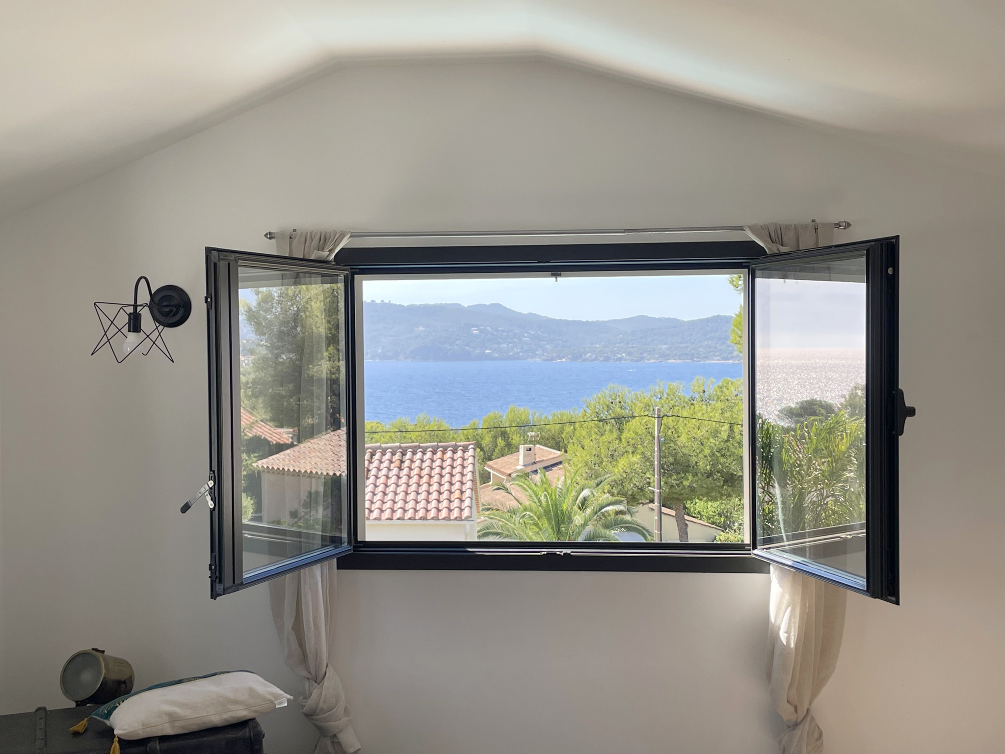 Belle villa individuelle de 173 m2, terrain arboré de 924 m2, nichée à Saint-Mandrier village, offrant une vue sur la mer et le pittoresque port de Saint-Mandrier, au calme, à moins de 10 minutes à pied des commodités, des plages...