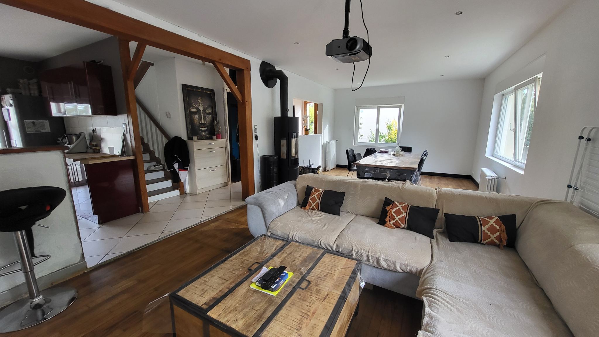 pièce de vie avec poêle à bois, buanderie, salle ...