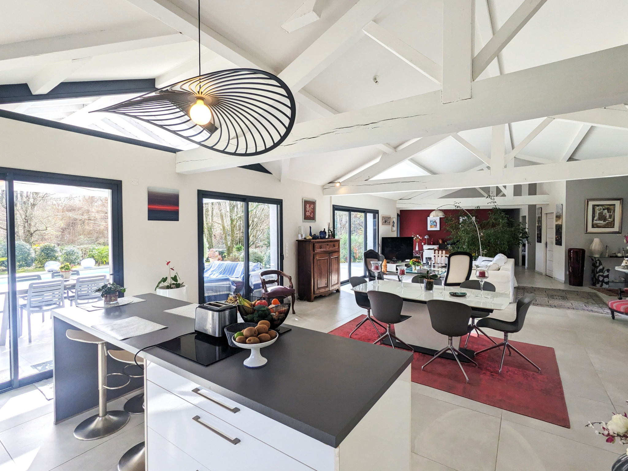 Nichée dans un environnement boisé et calme, cette superbe villa contemporaine de plain-pied de 180 m2, construite en 2013, offre des prestations de qualité et de très beaux volumes, le tout sur un terrain arboré de 2 000 m2 entouré par la forêt.