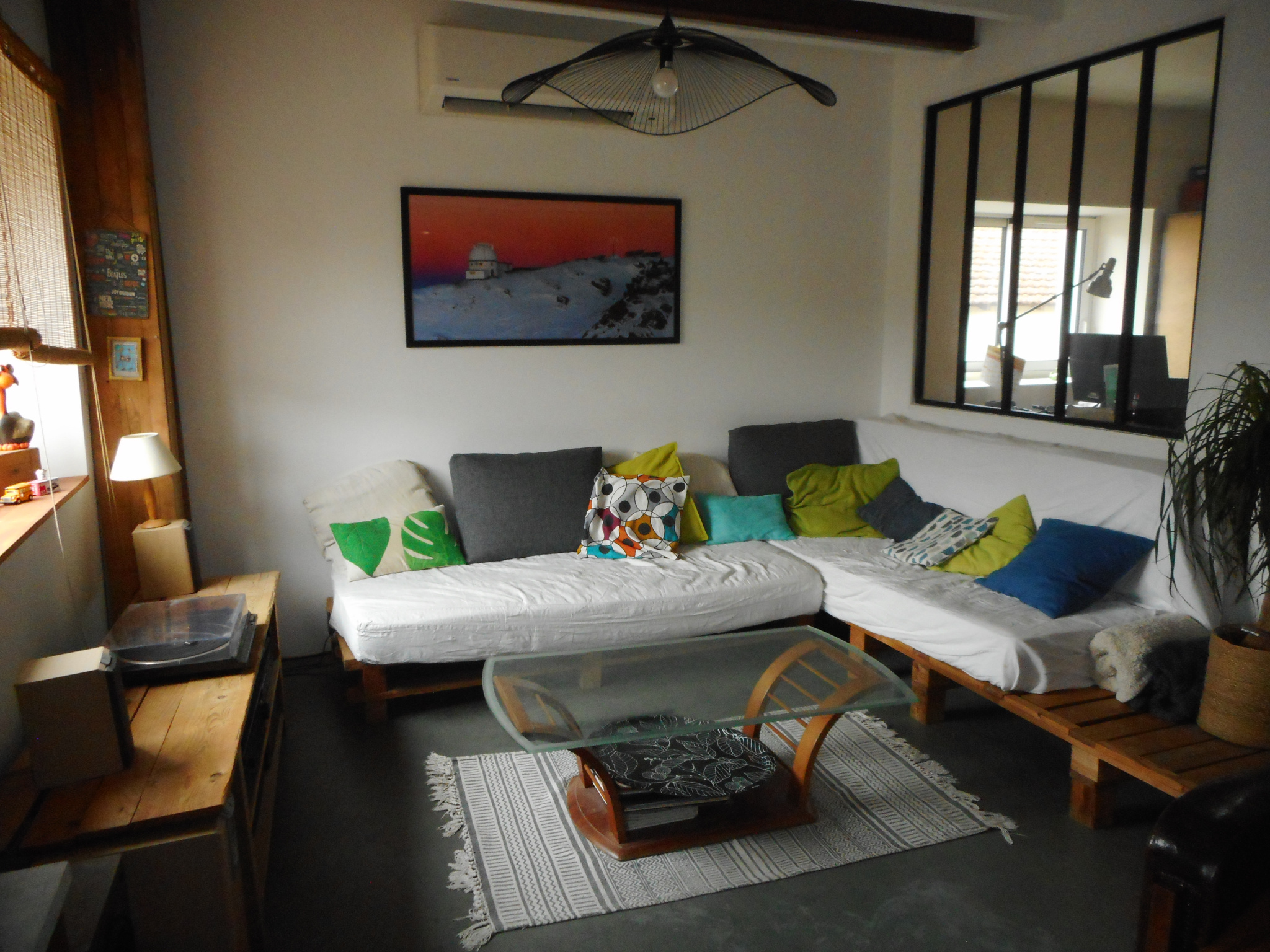 Une vaste pièce de vie de 68 m² avec poutres apparentes avec po...