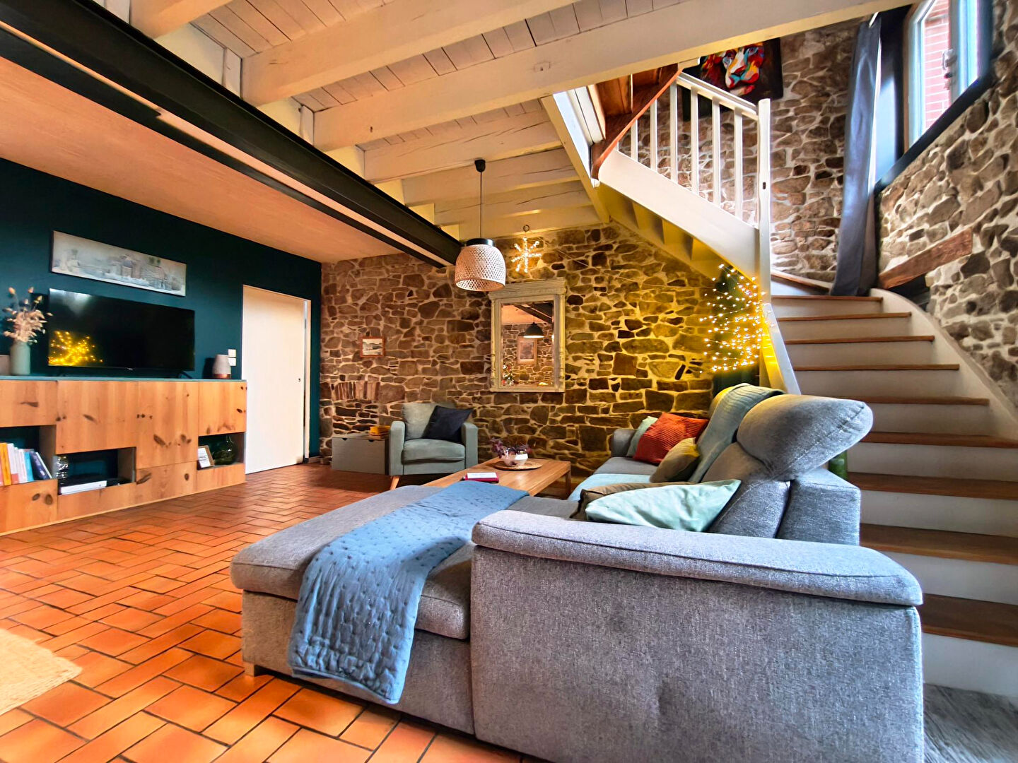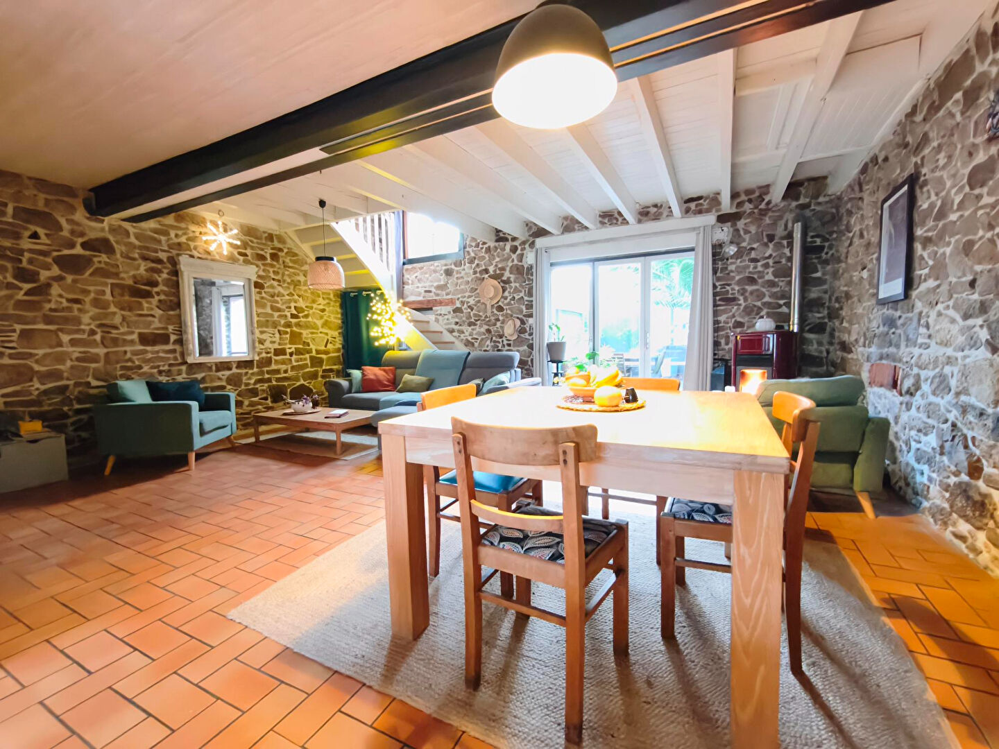 Dès l'entrée, un salon chaleureux avec poêle à bois s'ouvre sur une cuisine aménagée et équipée, offrant un espace de vie convivial idé...