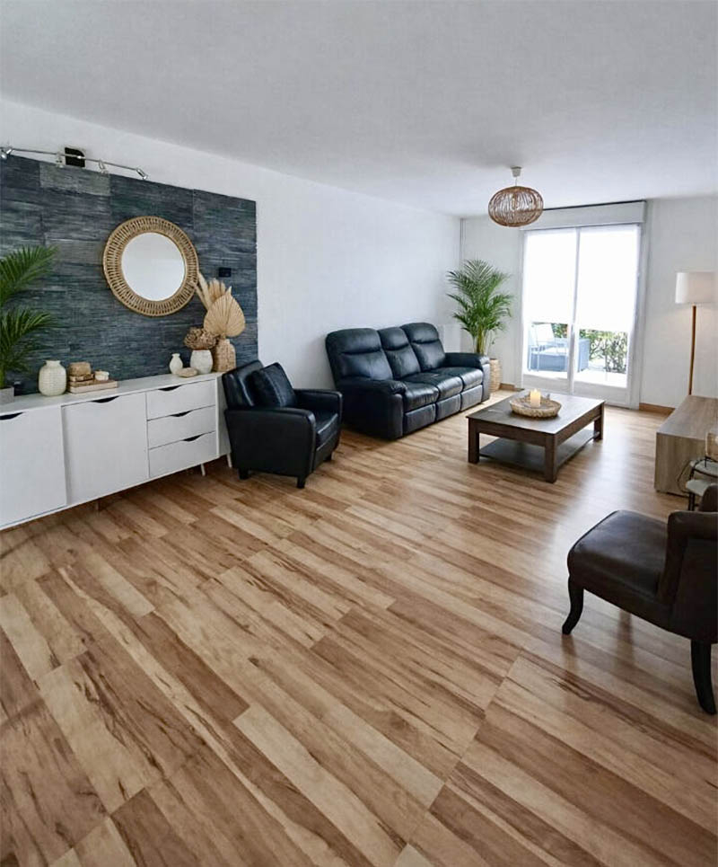 Cette maison propose un salon séjour ouvert sur la cuisine qui donne sur la terrasse et le jardin avec une exposition sud-ouest.