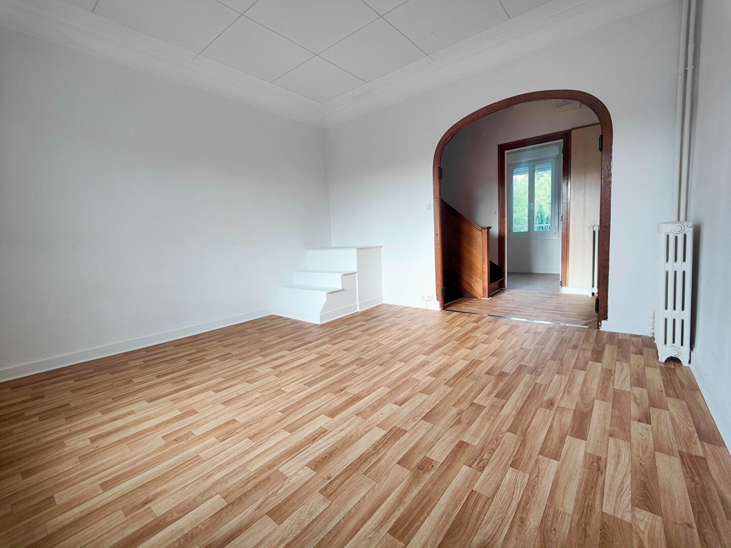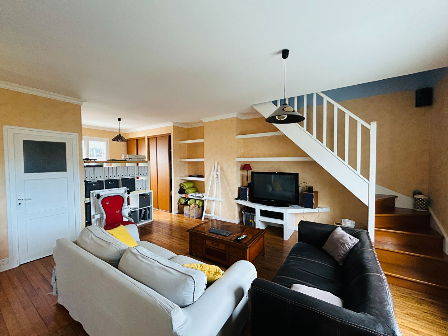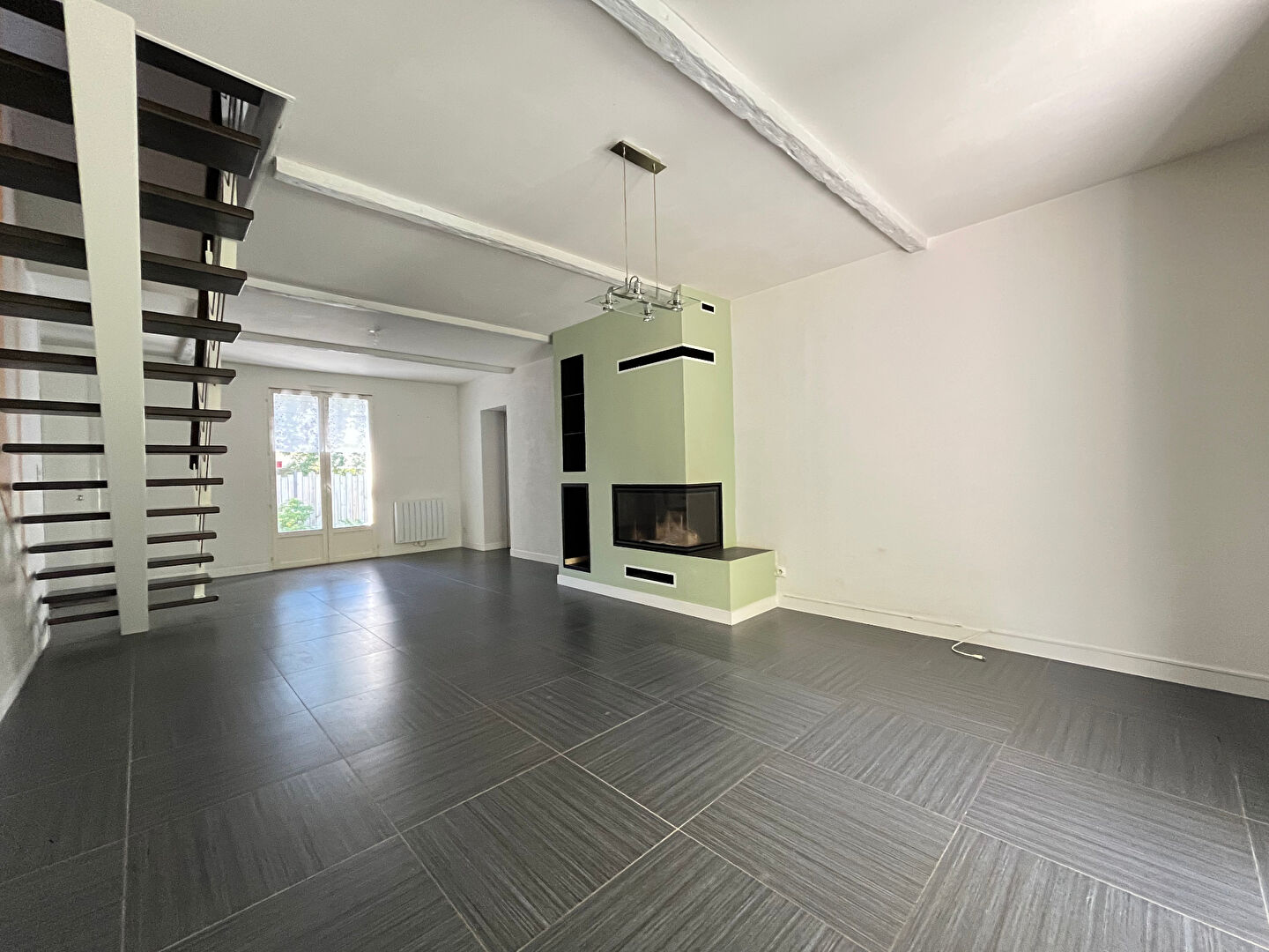 Pièces de vie lumineuse de 53 m2 avec cheminée, arrière cuisine et buanderie, wc.