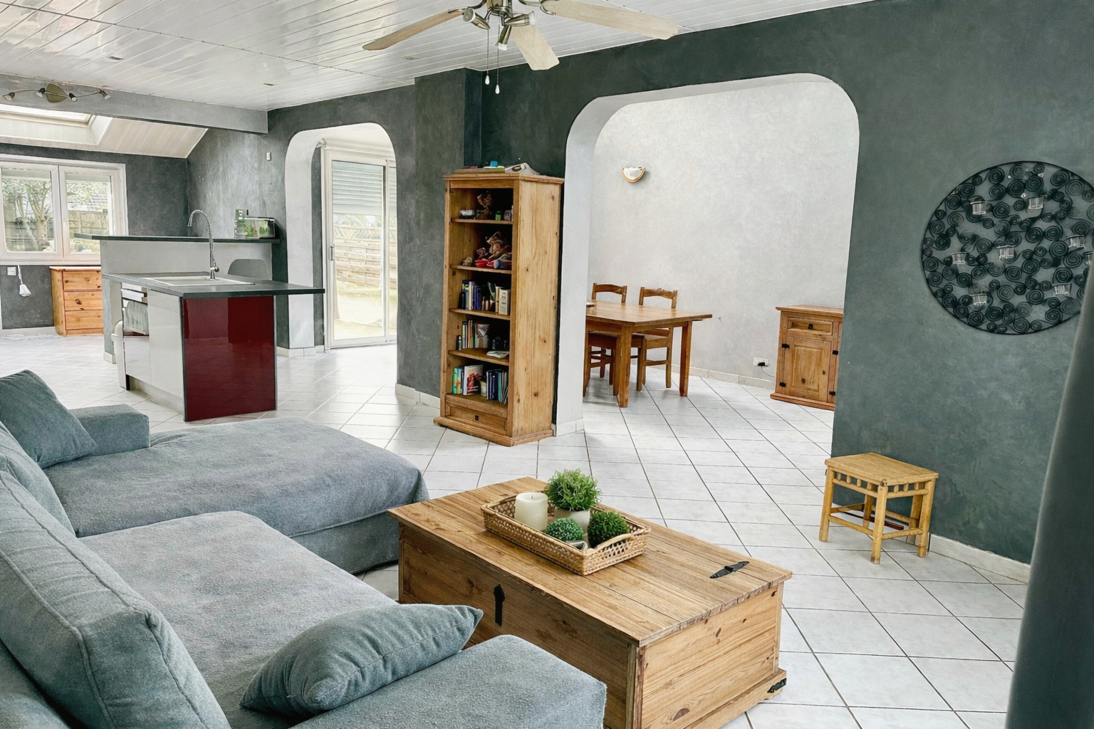 L'entrée mène vers la cuisine ouverte sur le salon séjour et sa baie donnant sur le jardin arboré.