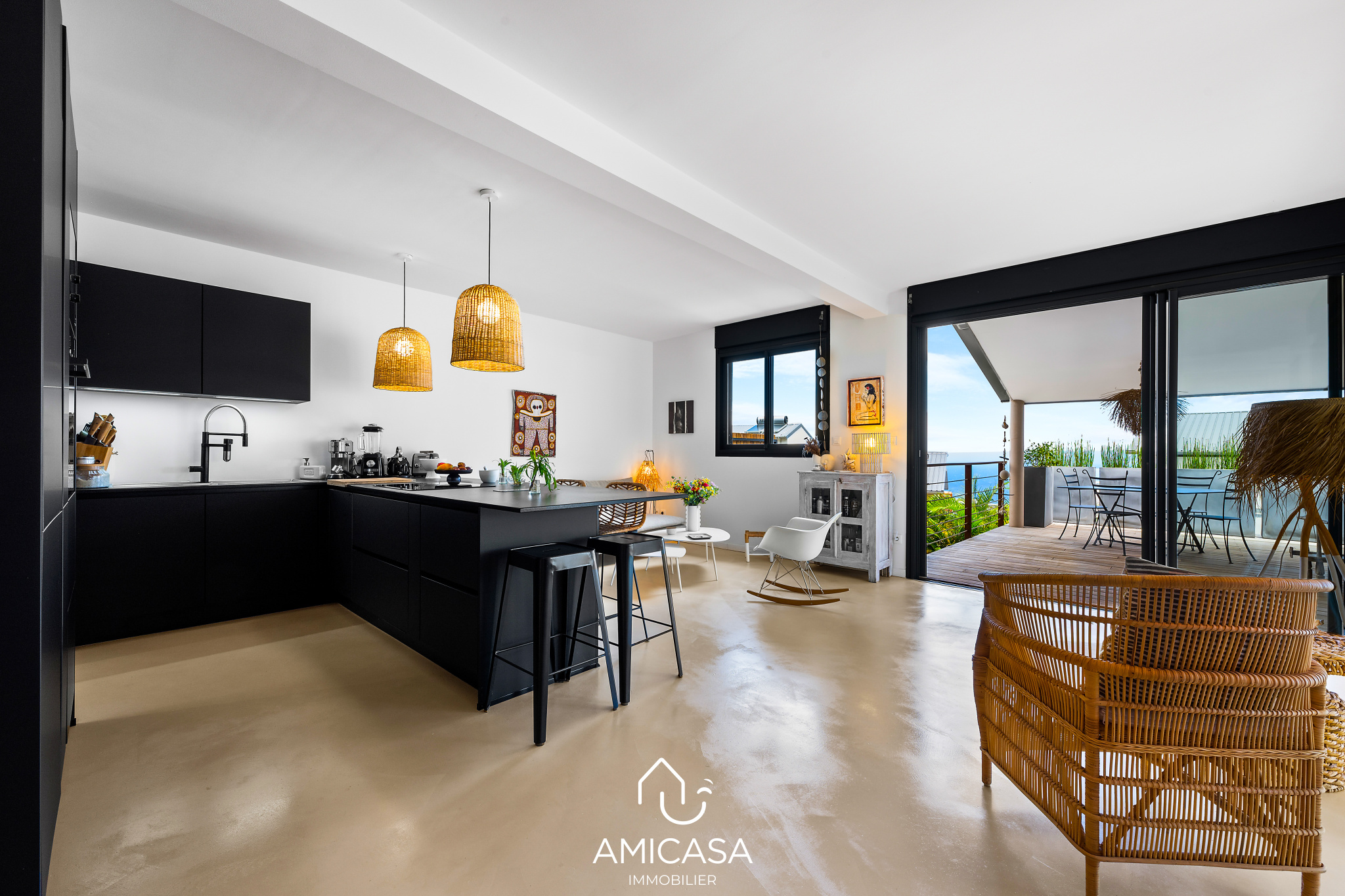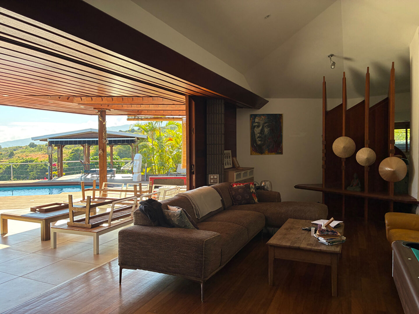 Je suis composée : d'un grande séjour avec cuisine équipée d'une surface de 47 m2 donnant sur une très belle varangue de 33 m2 avec une vue panoramique sur l...