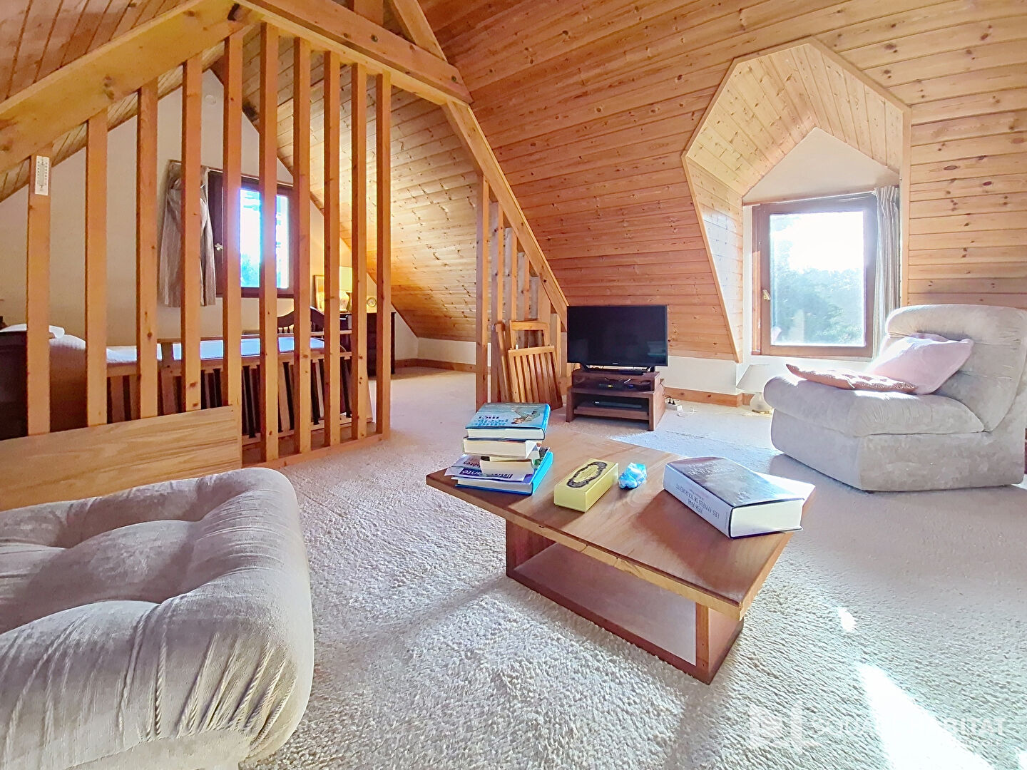 Au rez de chaussée: une entrée avec placard, grande cuisine fermée, salle de bains, WC, et un beau séjour cathédrale avec cheminée, chale...