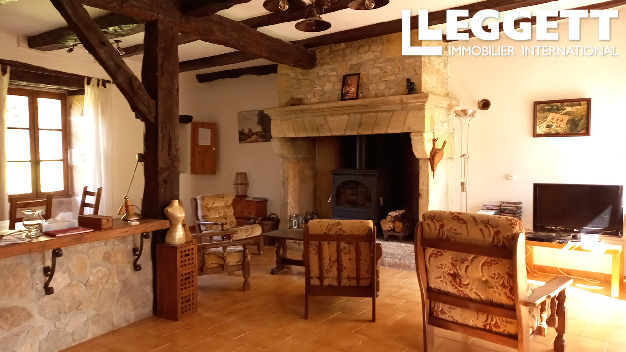 A40295RAD24 - Maison en pierre de 140 m² comprenant un grand salon/salle à manger (40 m²) avec une cheminée d'époque et des poutres apparentes. Elle dispose d'une cuisine équipée (15 m²) et d'une salle de bains avec baignoire/douche, lavabo et W...