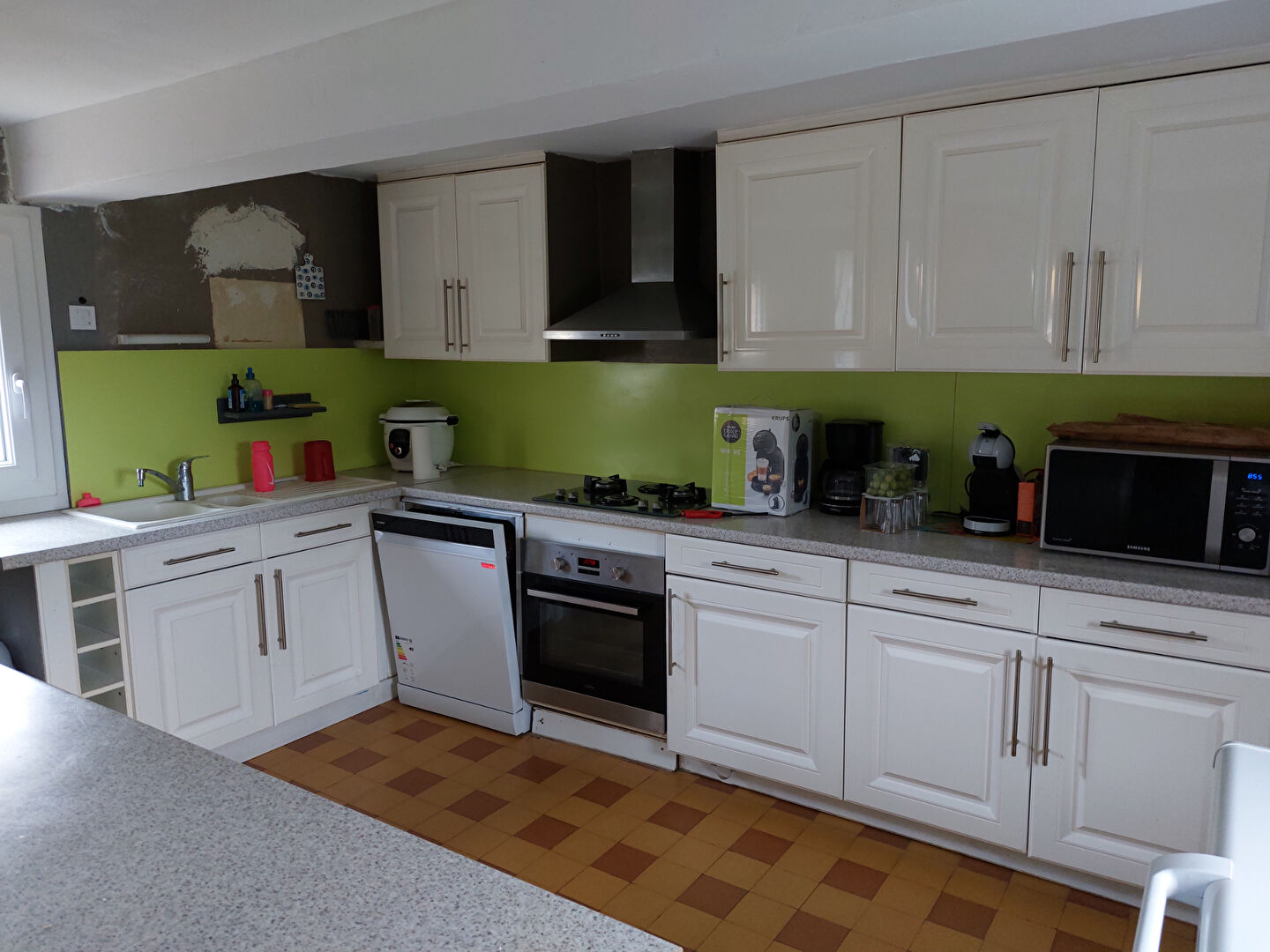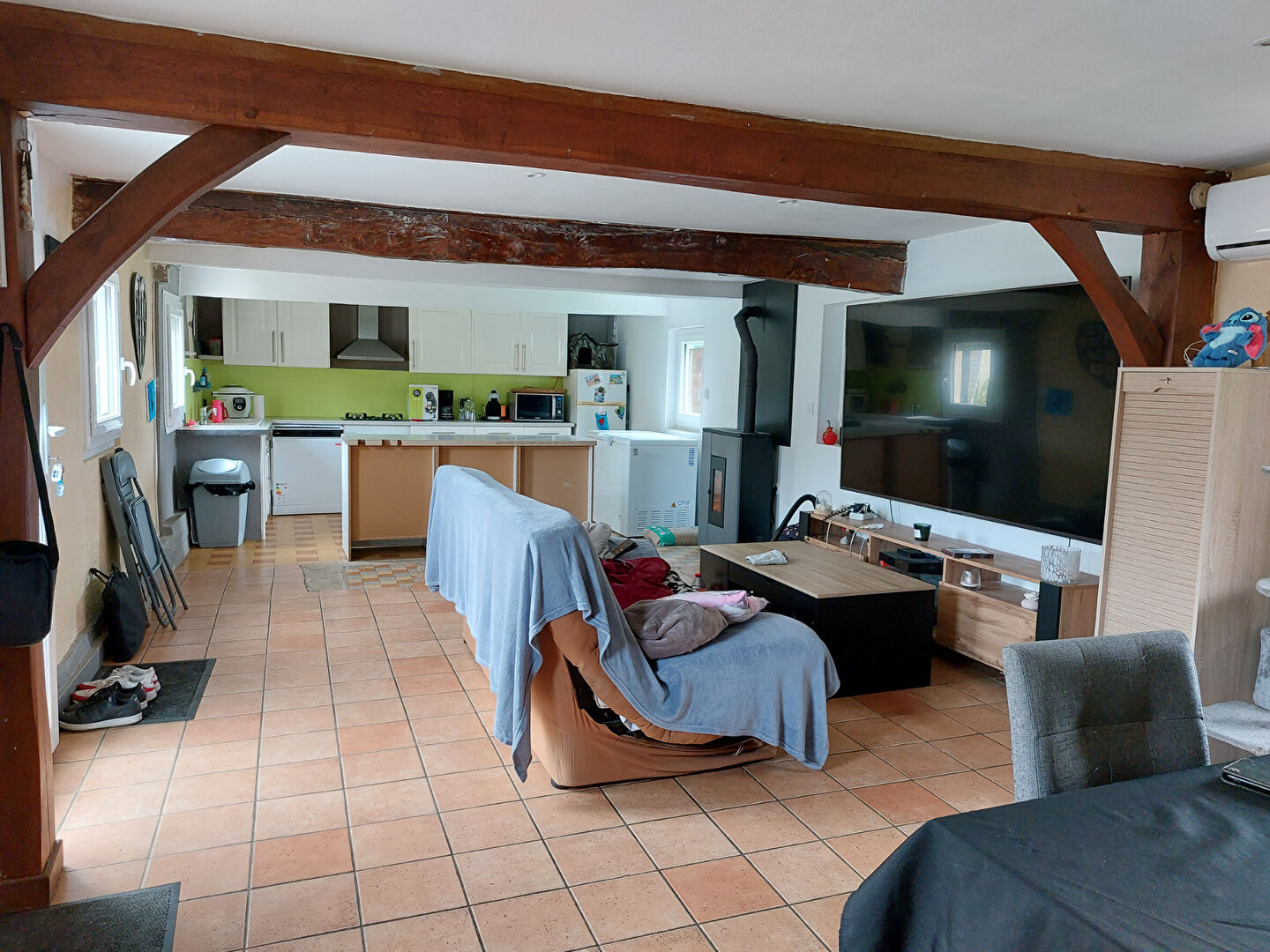 Divisé en entrée dans pièce à vivre avec poêle à granulé ouverte sur cuisine aménagée, salle d'eau avec WC.