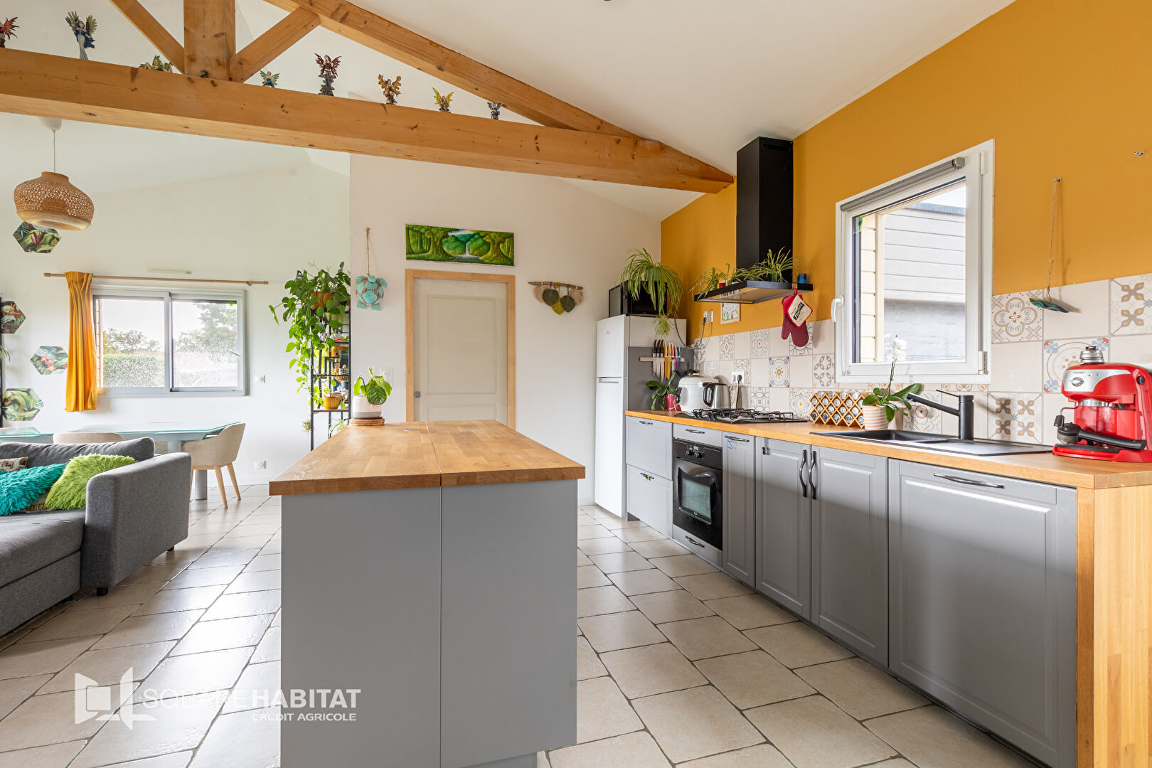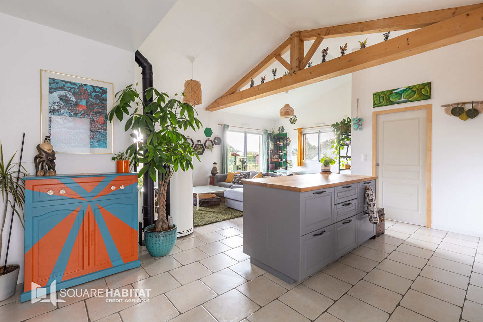 Vous tomberez sous le charme de sa pièce de vie avec pierres et poutres apparentes vue su...