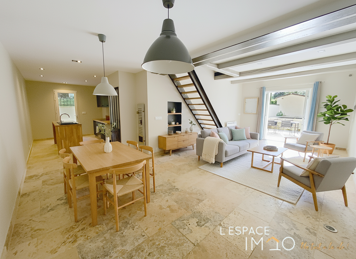 Il offre une belle pièce de vie en L avec cuisine ouverte, donnant sur une agréable terrasse et son extérieur avec bassin.